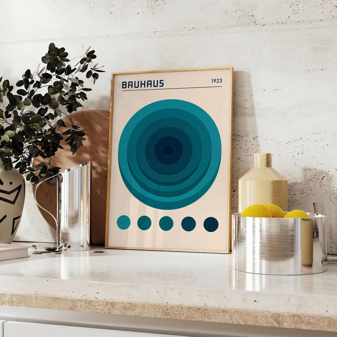 Discover the allure of Bauhaus poster art with our Bauhaus Blue Circle design. This vintage poster features vibrant blue and green hues, perfect for modern aesthetics. Buy your Bauhaus art poster today in sizes A4, 30×40 cm, 50×70 cm, 60×80 cm, and A0.