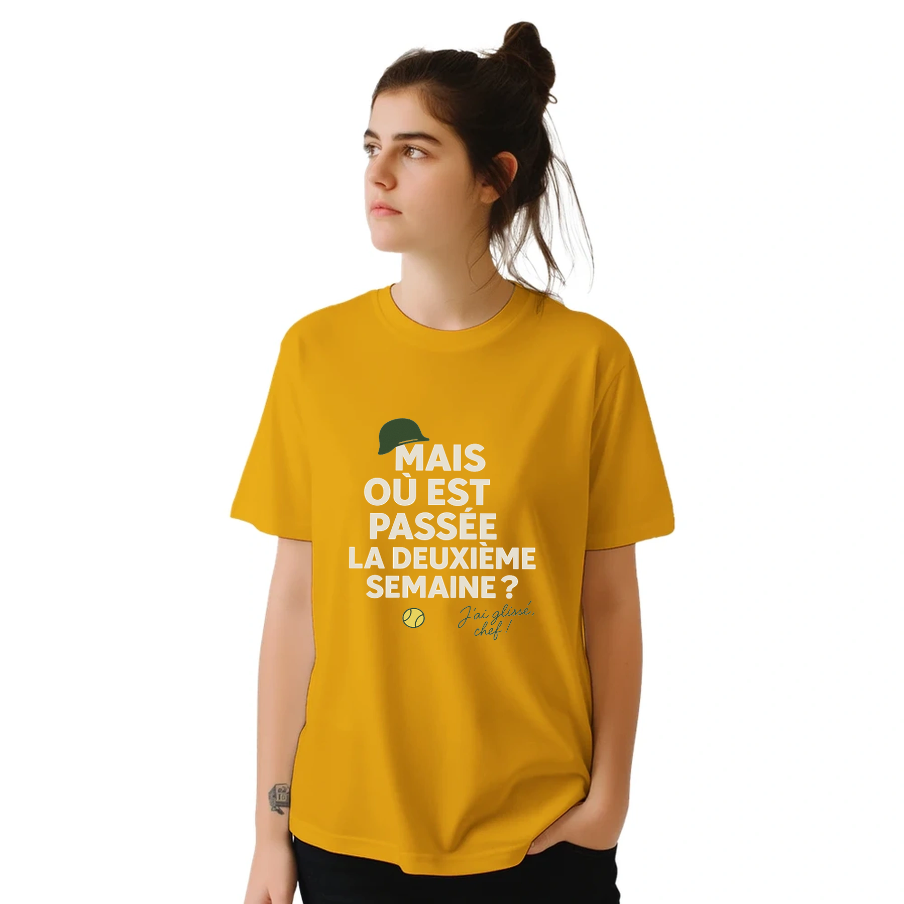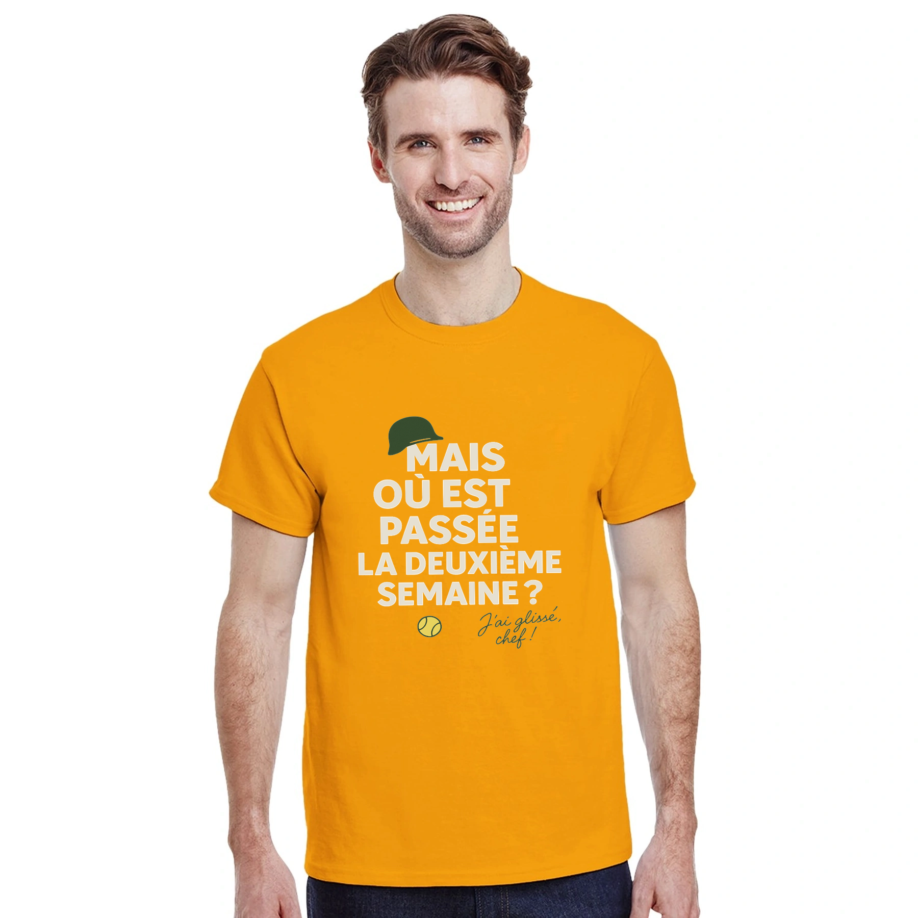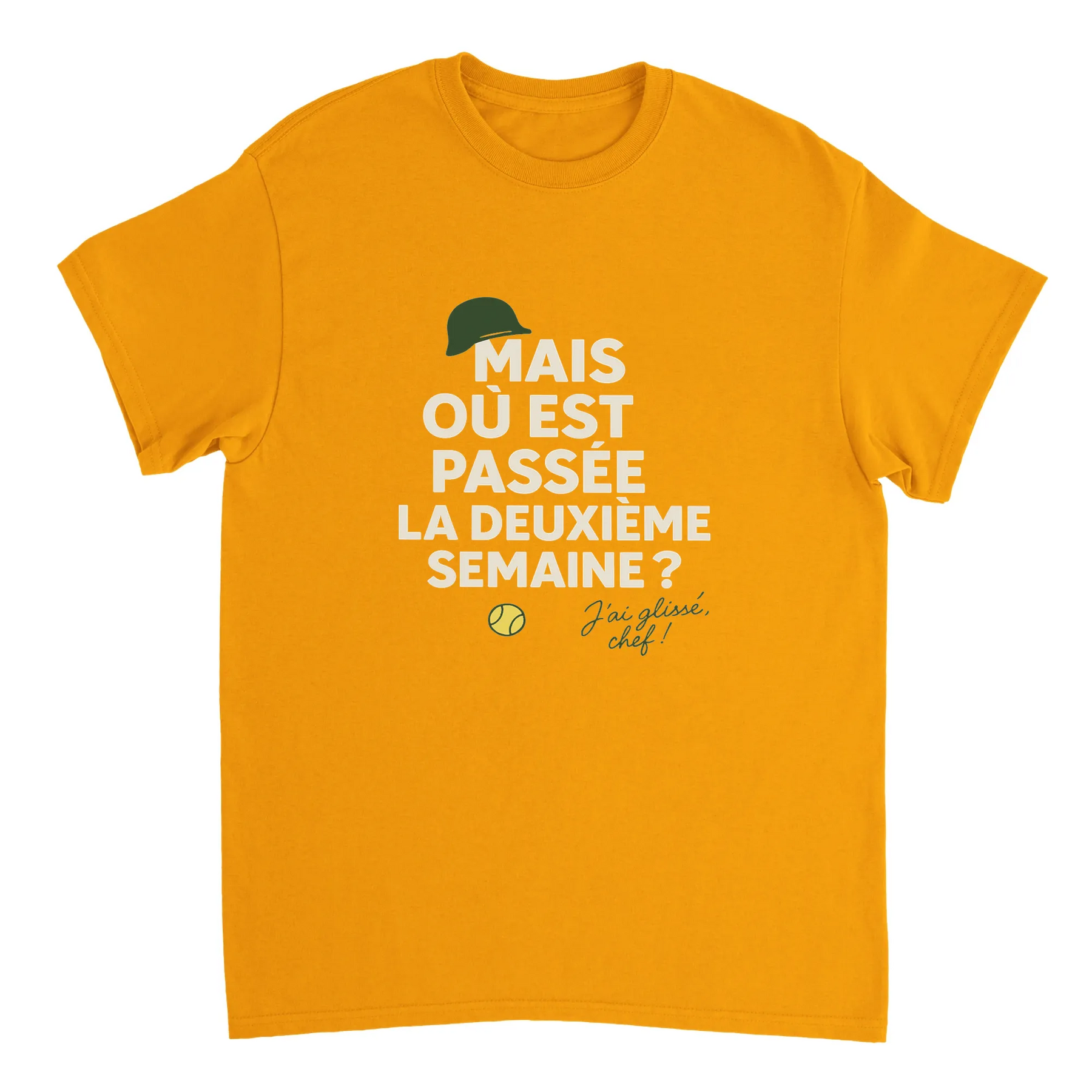 Image Gold de Où est passée la deuxième semaine Tennis Tshirt [color:gold] [view:front]