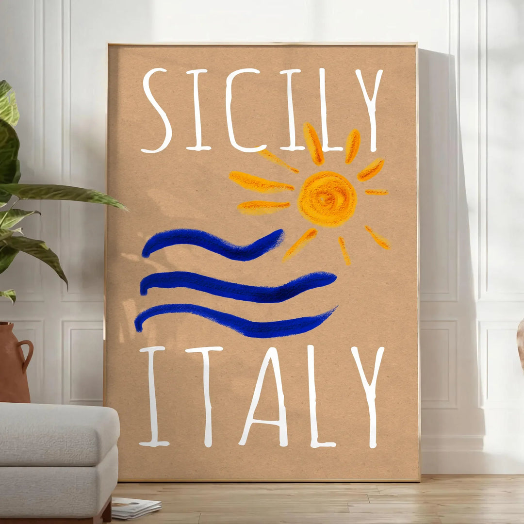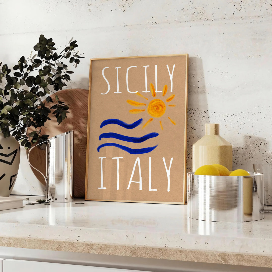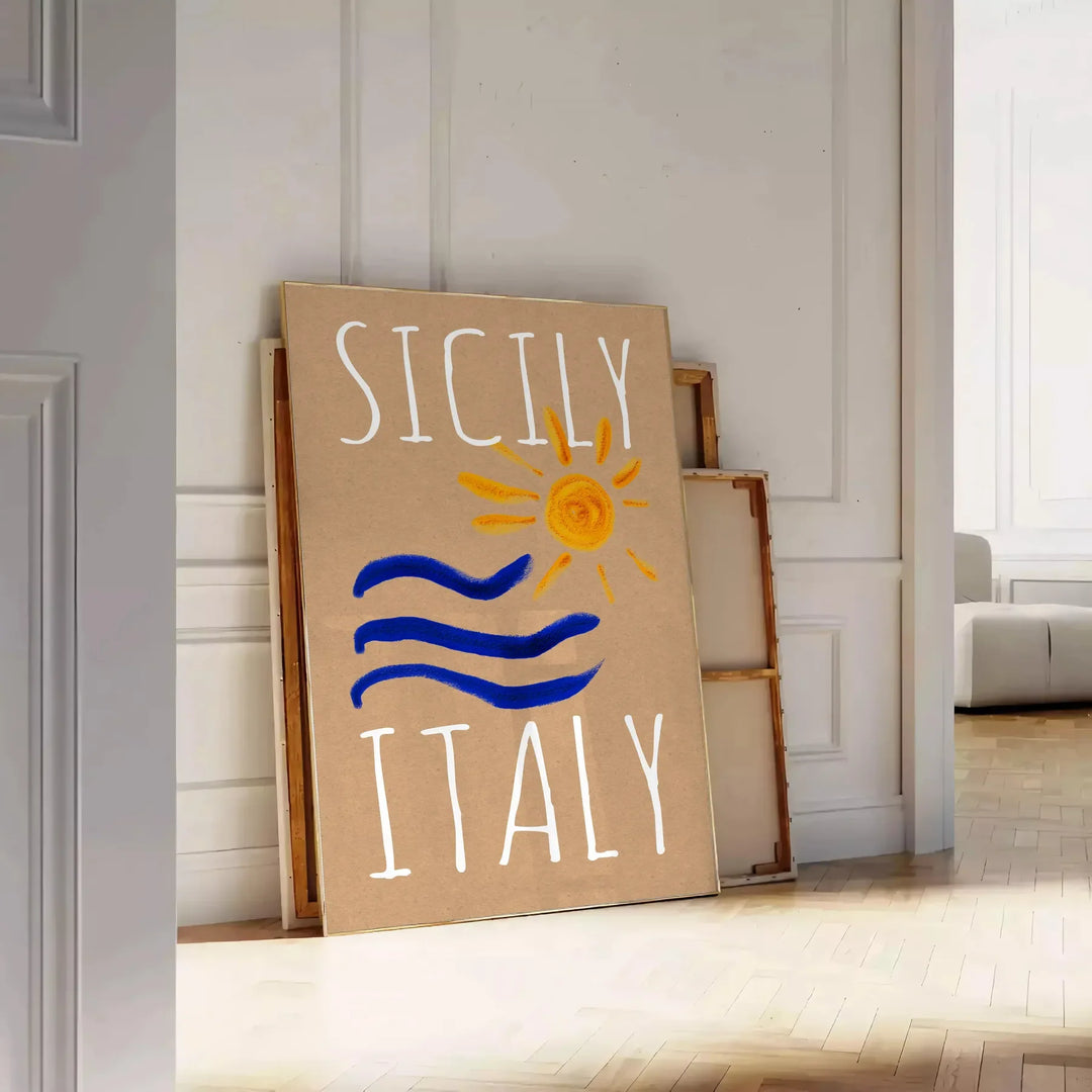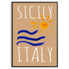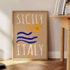 charm Sicily vintage poster vibrant blue orange hues stunning wall art piece Italy essence artwork space unique gift sizes A4 cm A0