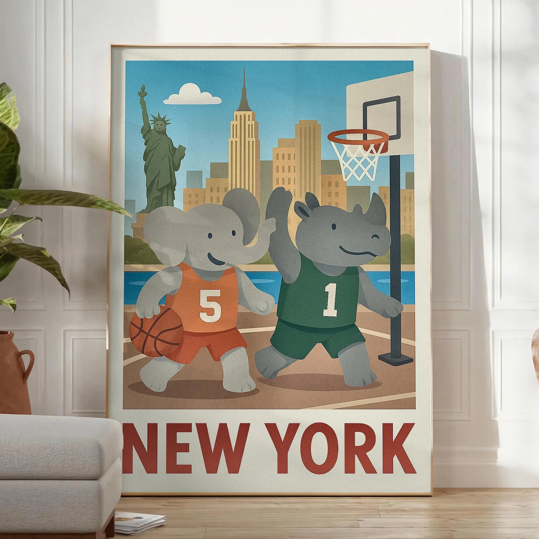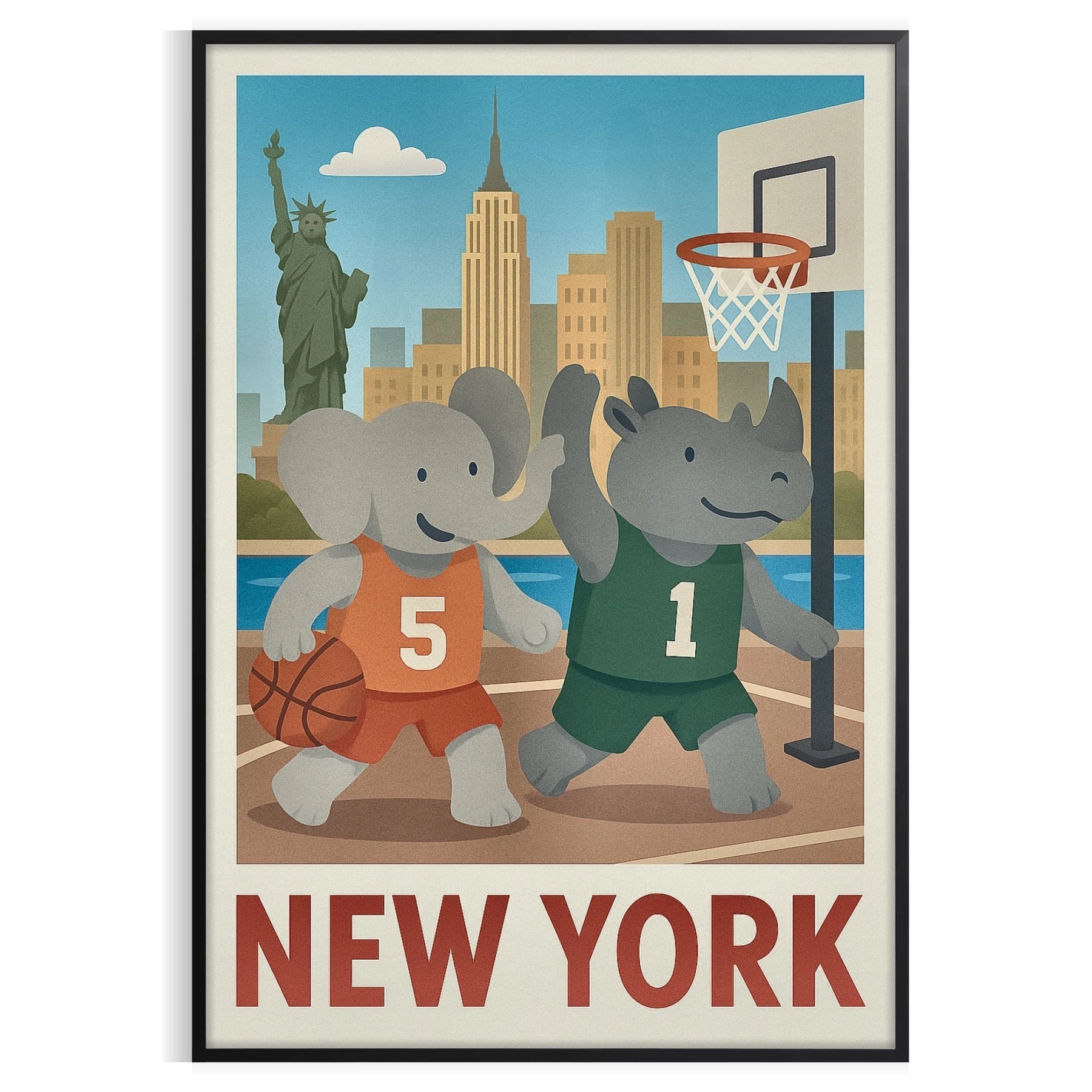 Ανακαλύψτε το μοναδικό vintage πόστερ μπάσκετ με έναν παιχνιδιάρη ελέφαντα και ρινόκερο σε μια ζωντανή σκηνή μπάσκετ της Νέας Υόρκης. Ιδανικό για τους λάτρεις του μπάσκετ ή ως σκέψη για δώρο.