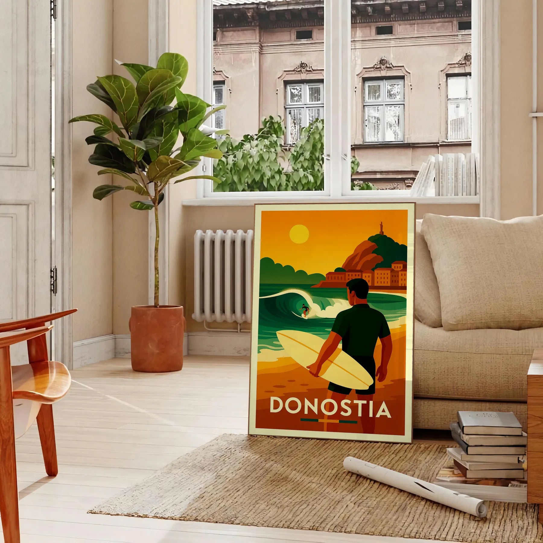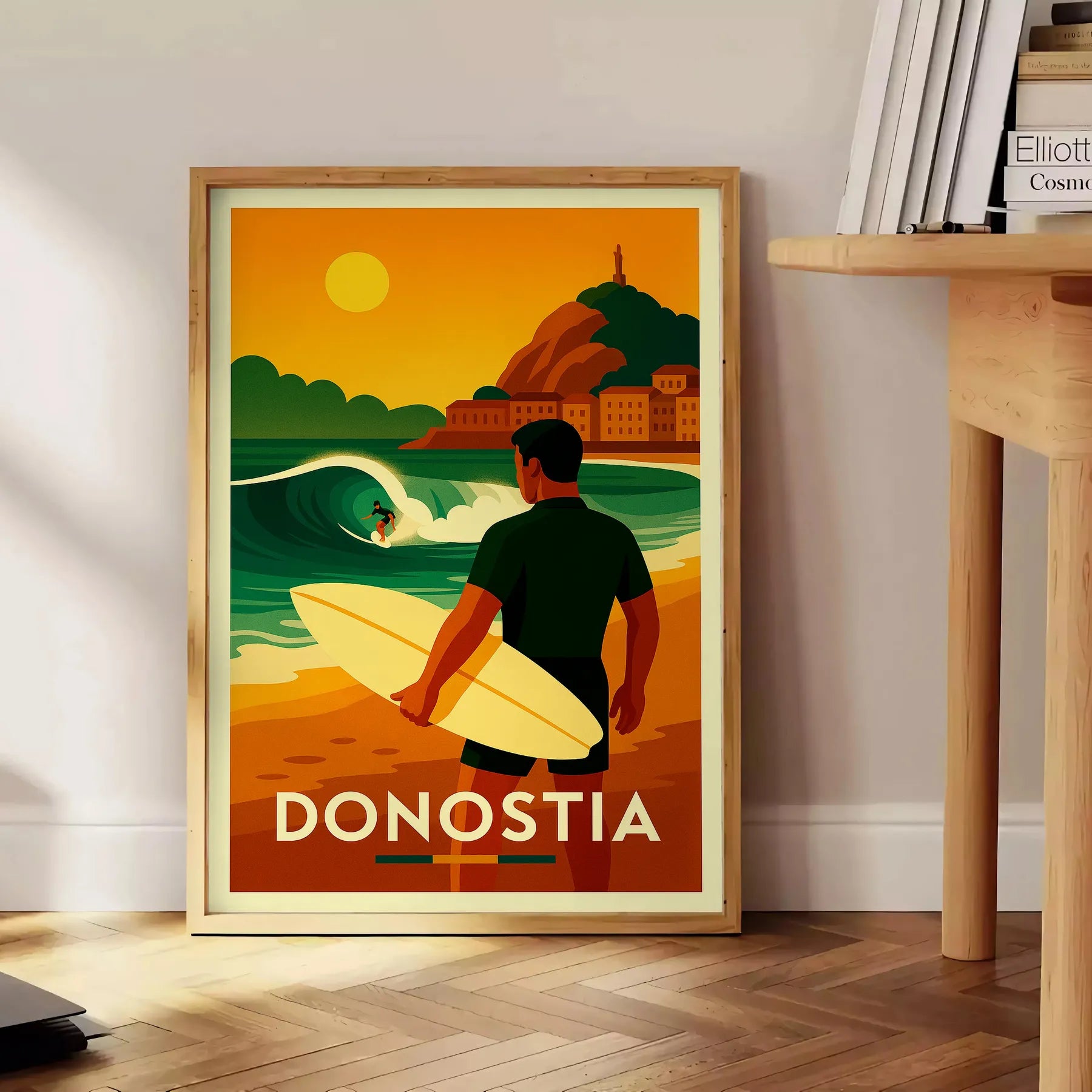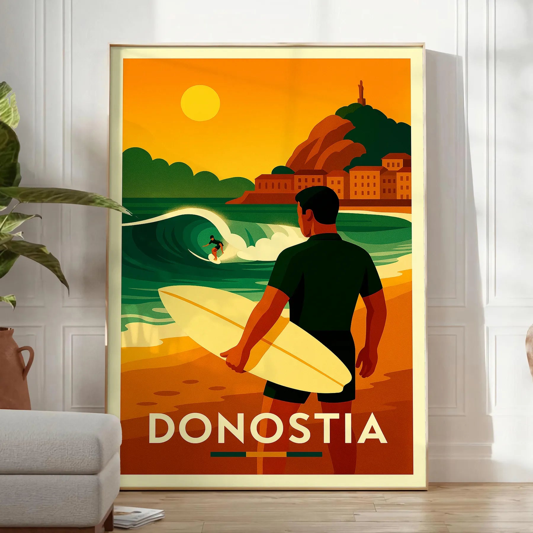 Βυθιστείτε στη ζωντανή κουλτούρα του surf του Σαν Σεμπαστιάν με αυτήν την εκπληκτική αφίσα! Με έντονα πράσινα και κόκκινα χρώματα, είναι ιδανική για κάθε λάτρη του surf ή της τέχνης.