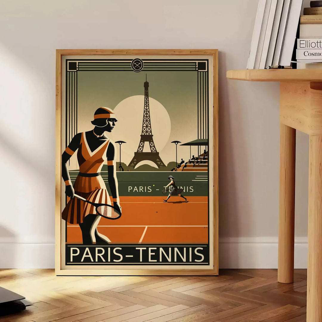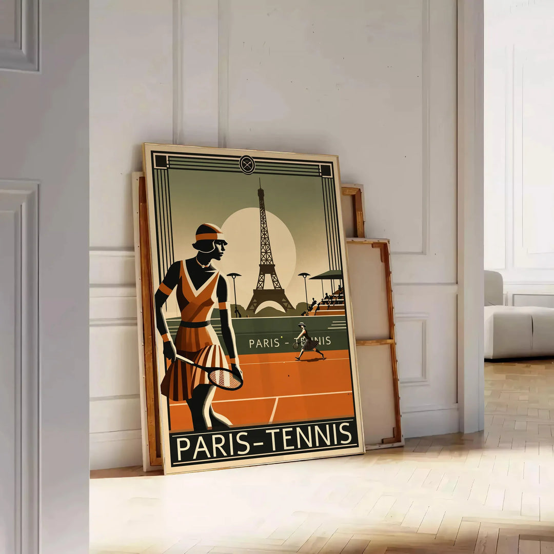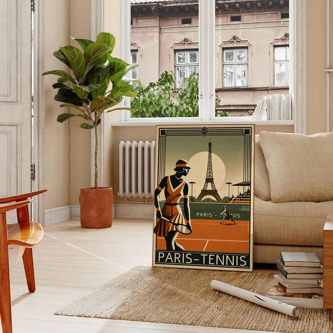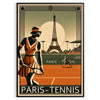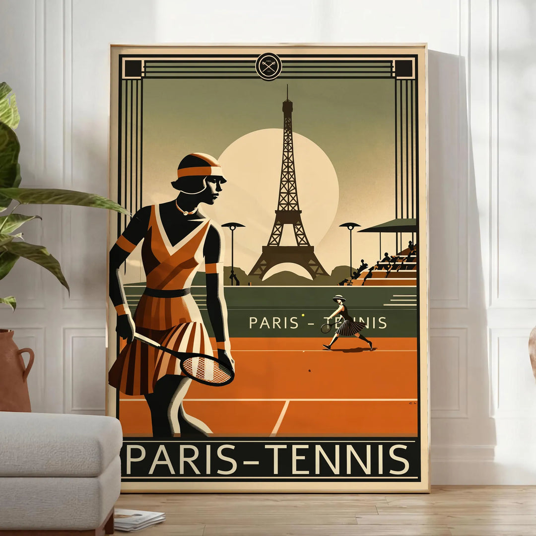 Póster de tenis parisino en negro y marrón, ideal para amantes del deporte y de París, disponible en varias tamaños
