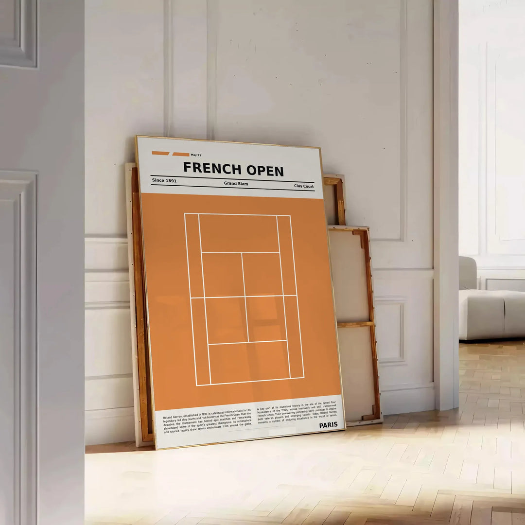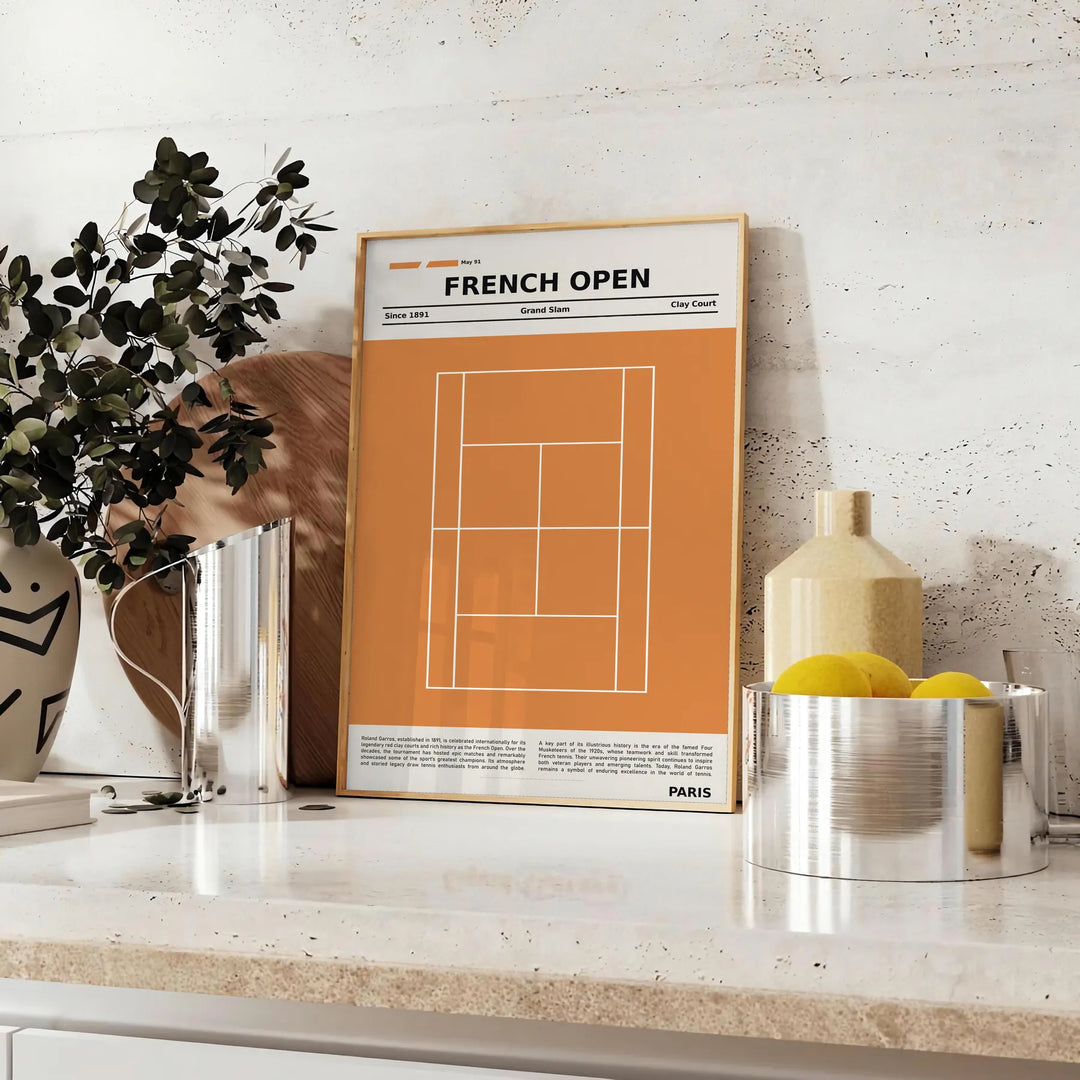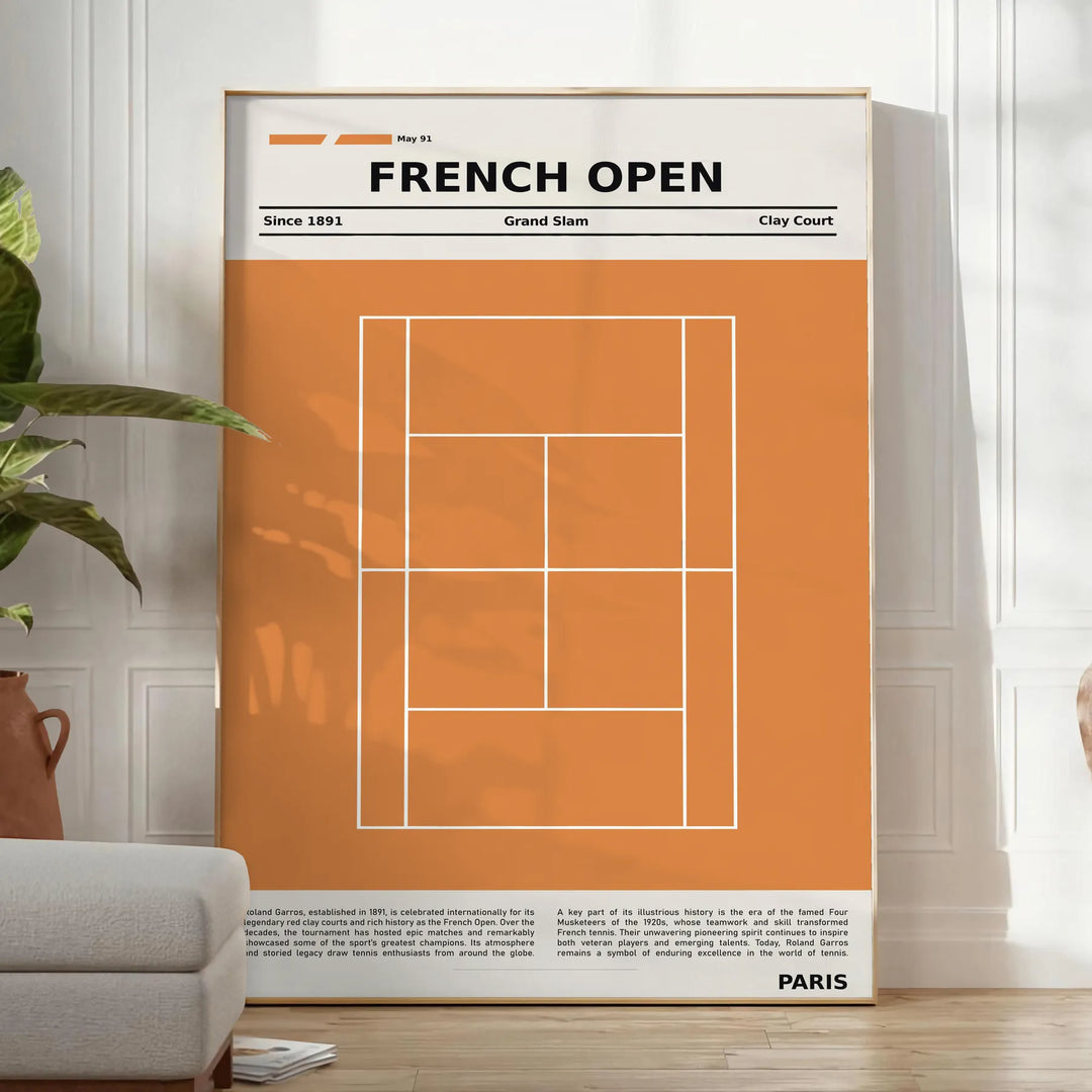 Celebra la emoción del Grand Slam de Roland Garros con este impresionante póster de tenis. Con un dinámico diseño en blanco y negro, captura el espíritu y la elegancia de este deporte. Perfecto para la colección de cualquier aficionado al tenis. Disponible con y sin marco.
