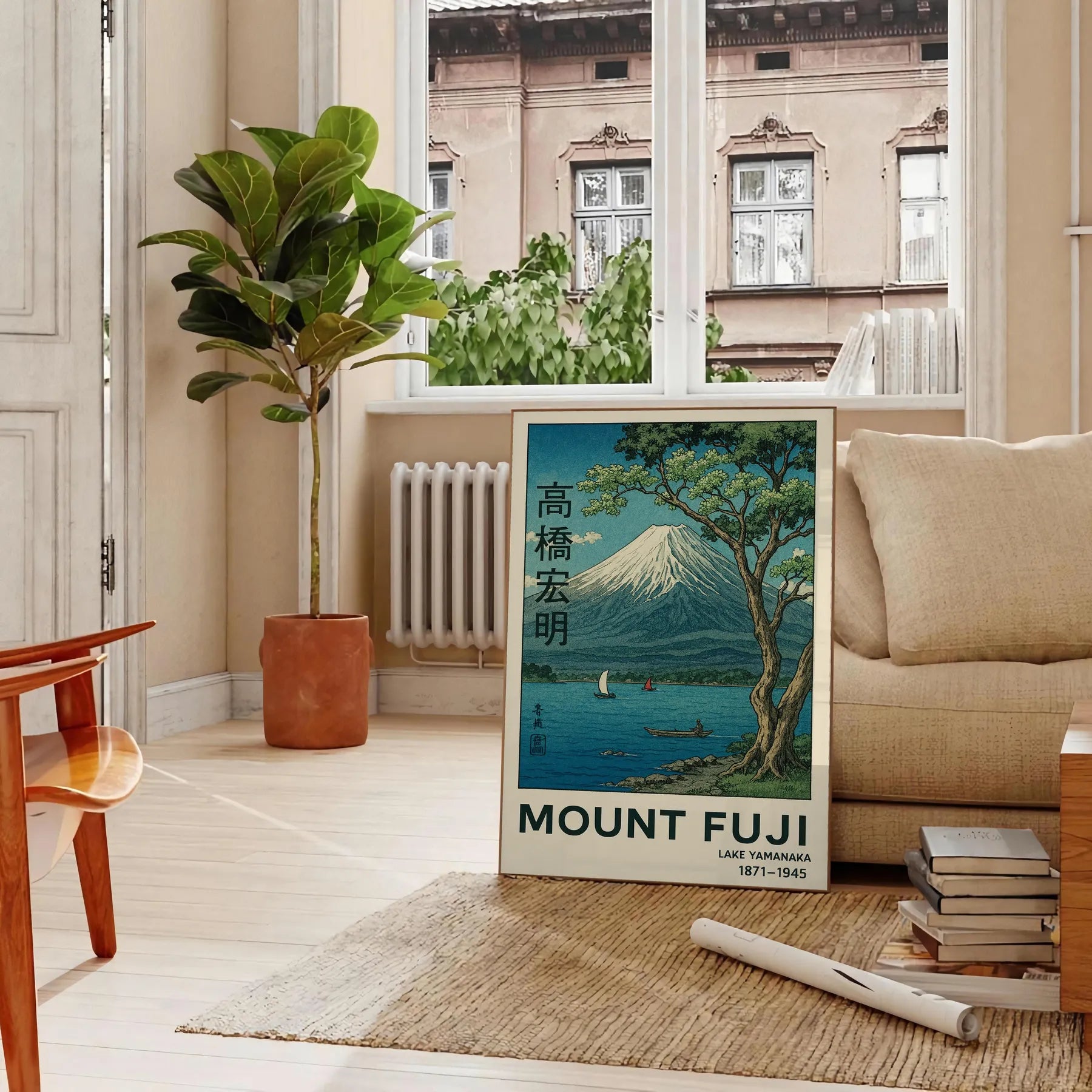 Poster di Mont Fuji e Lago Yamanaka, con tonalità serene di blu e verde. Disponibile in formato 50x70 o 30x40, con opzione in