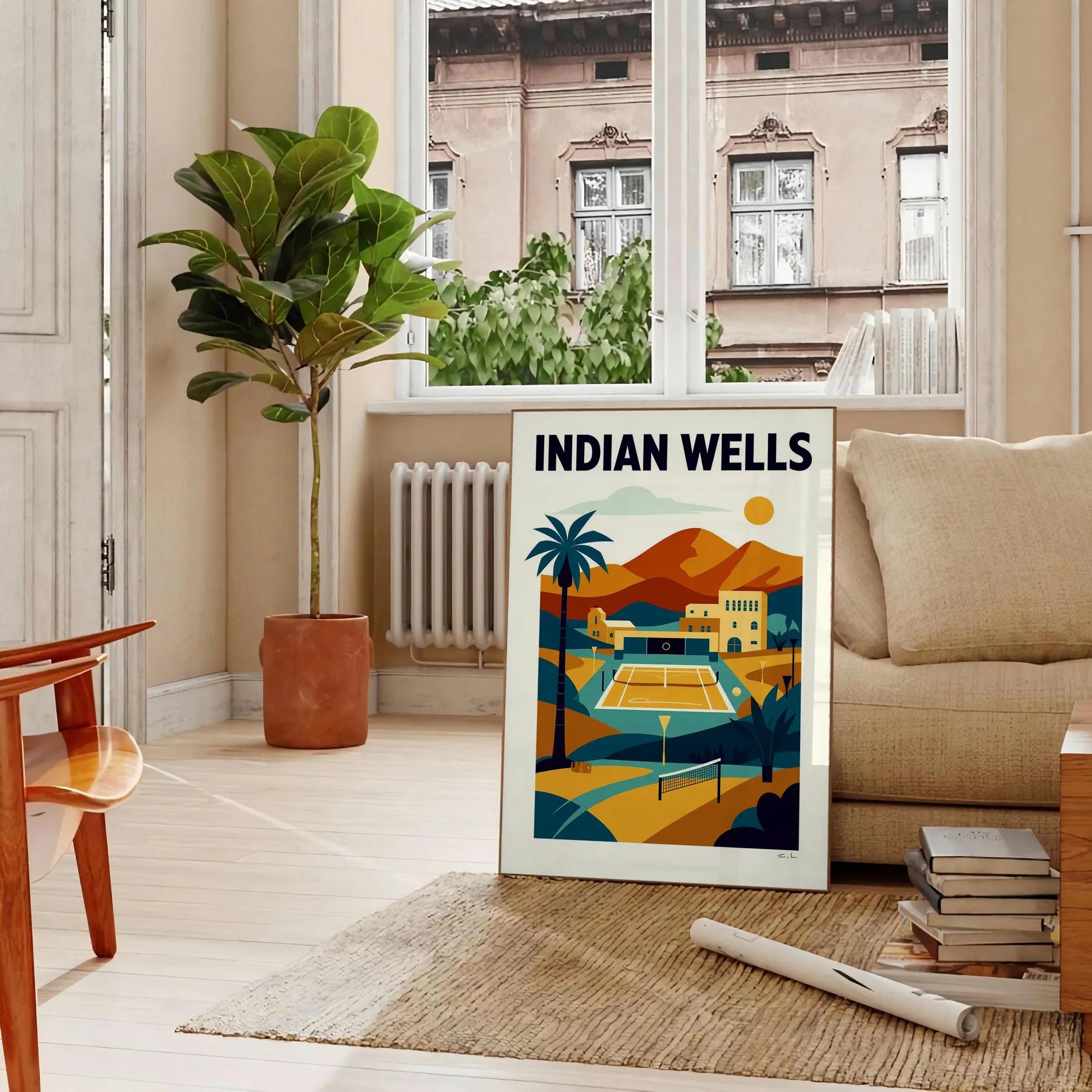 Ravviva il tuo spazio con il poster di tennis Indian Wells, caratterizzato da vivaci tonalità arancioni e verdi. Questo pezzo d'arte è perfetto per appassionati di tennis e sportivi.