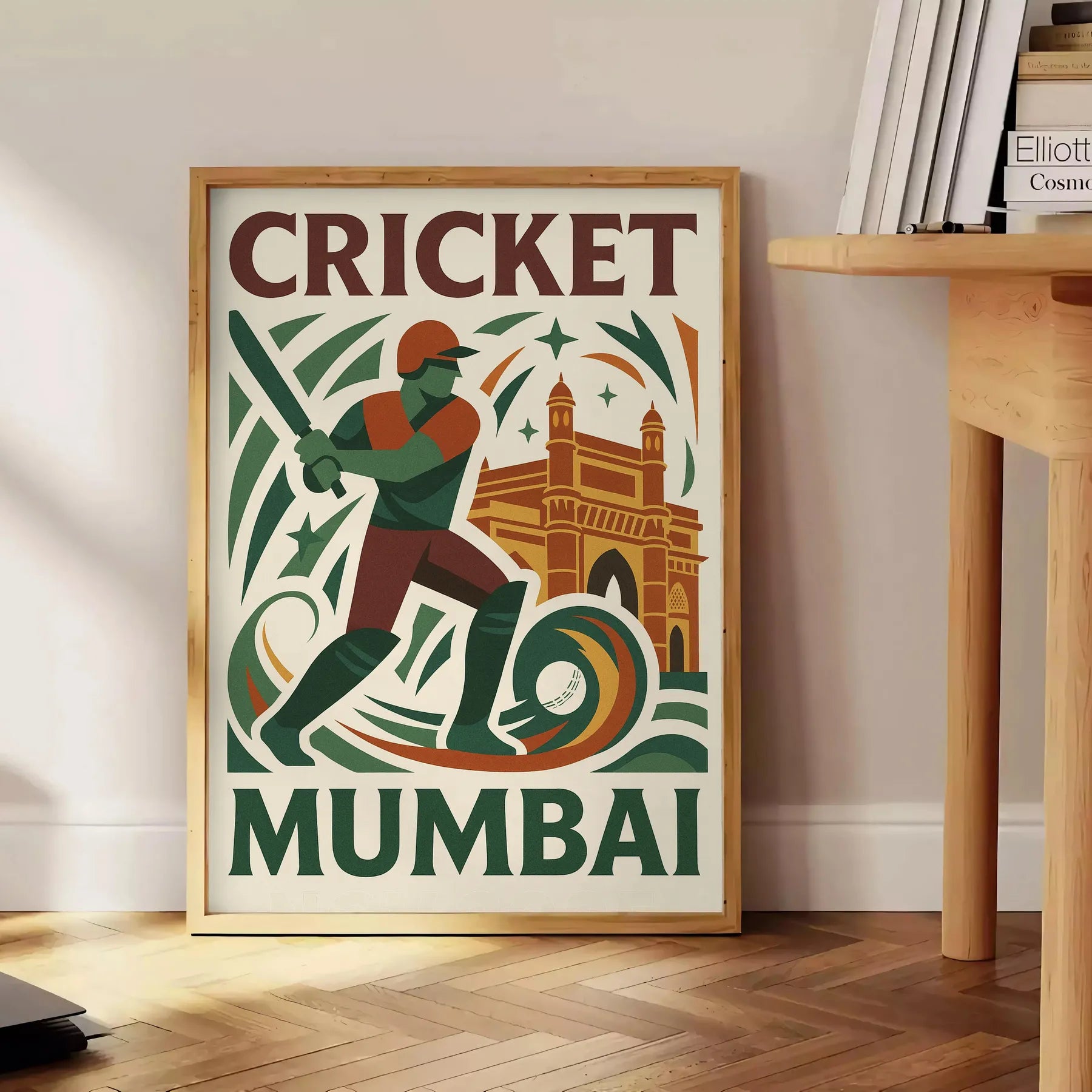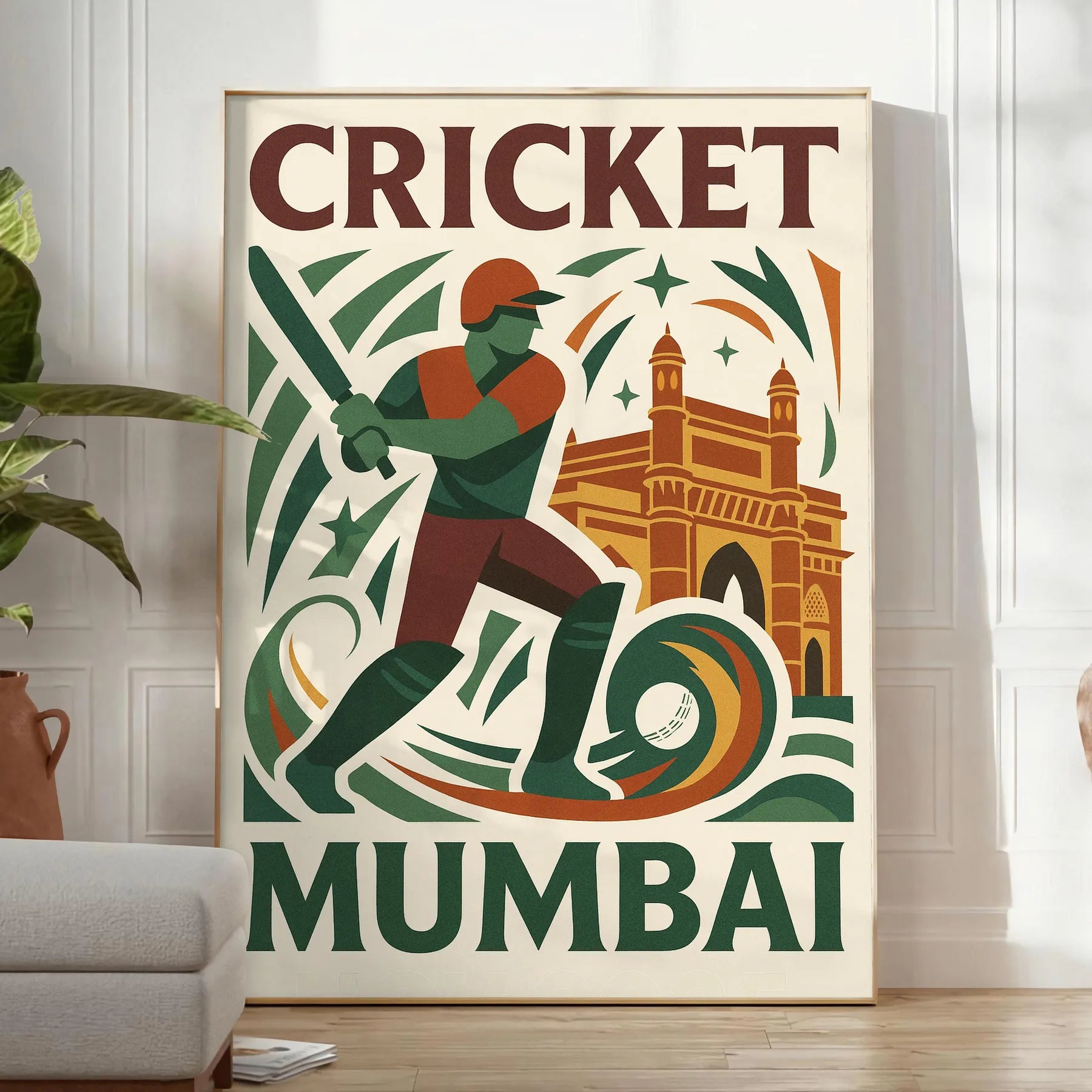 ムンバイのスポーツ文化を祝うクリケットテーマのポスター。グレーとホワイトの洗練されたデザインで、クリケット愛好者に最適です。サイズはA4、30x40cm、50x70cm、60x80cm、A0からお選びいただけます。