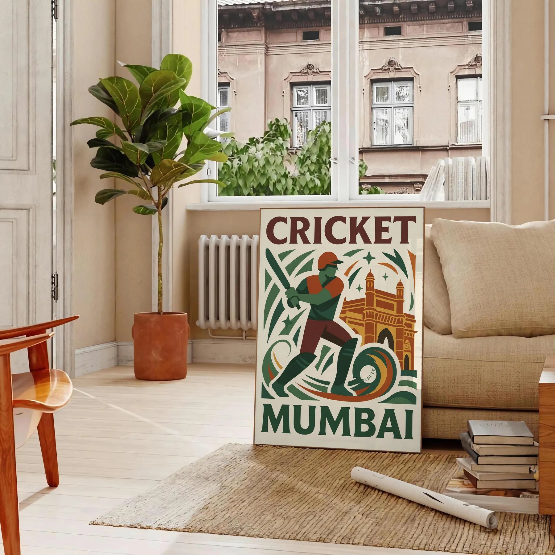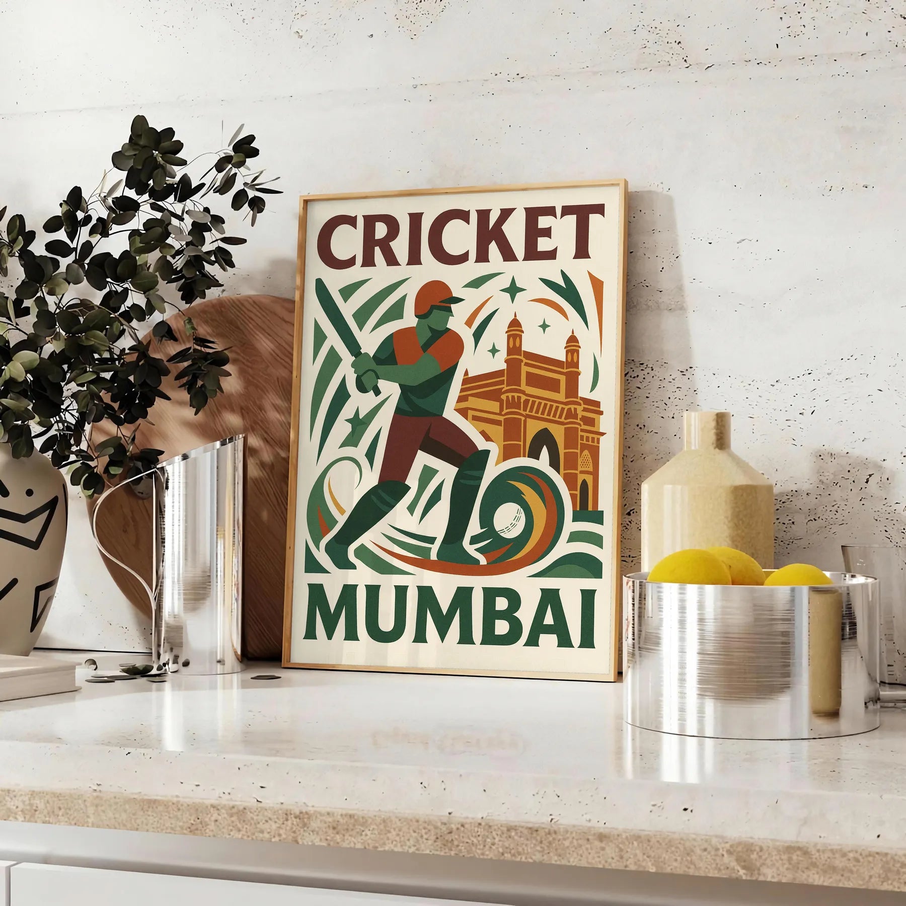 ムンバイのスポーツ文化を称賛する美しいクリケットテーマのポスターで、あなたの空間を格上げしましょう。グレーとホワイトの洗練されたデザインで、クリケット愛好家に最適です。