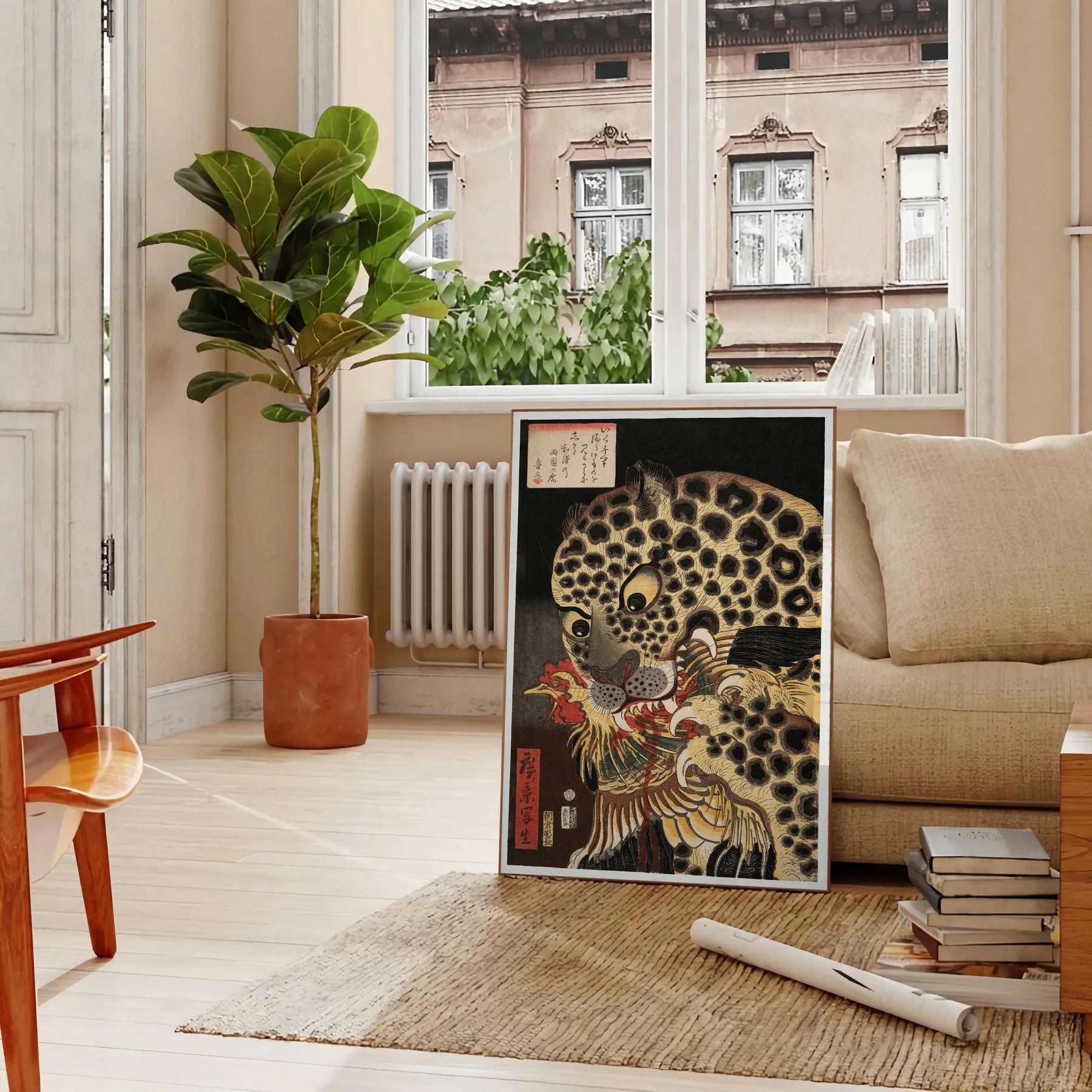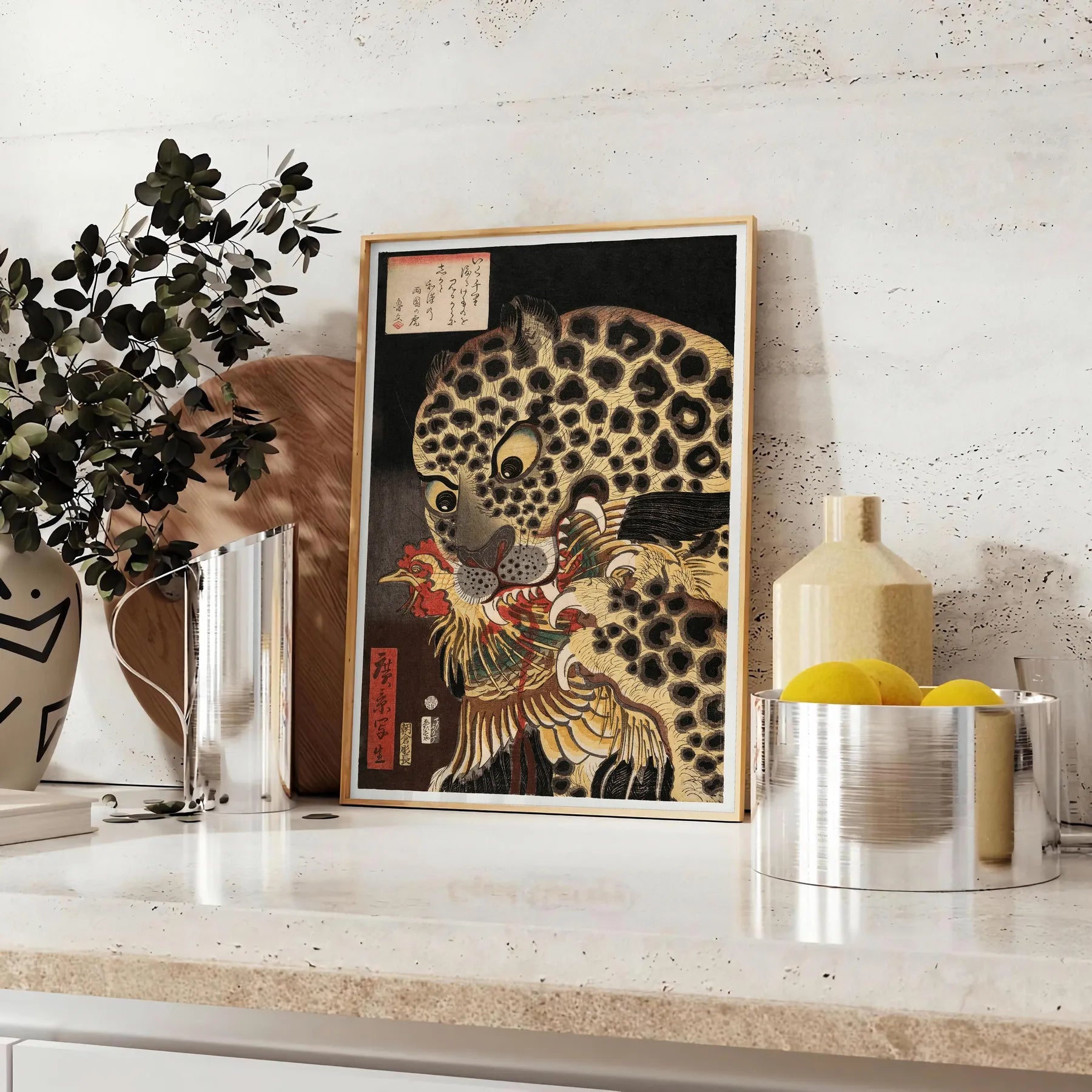 「浮世絵: 緑谷の虎」ポスターは、洗練されたグレーとグリーンのパレットが印象的なアート作品です。50x70cmまたは30x40cmの2サイズからお選びいただけます。