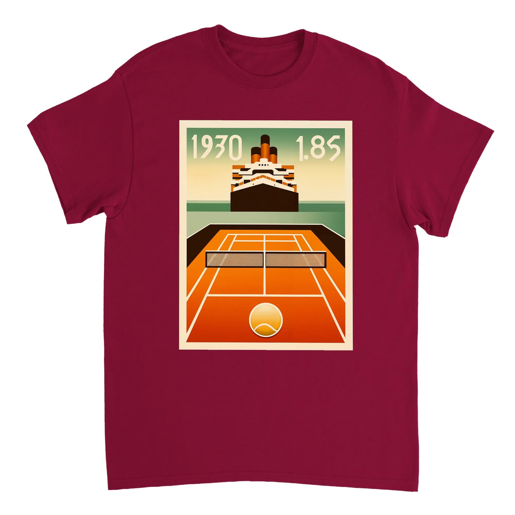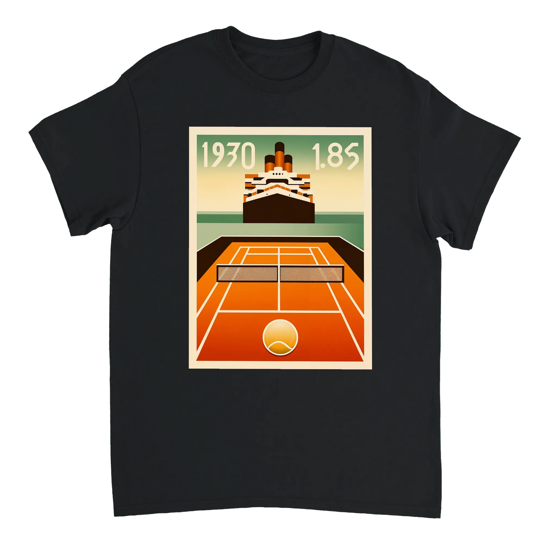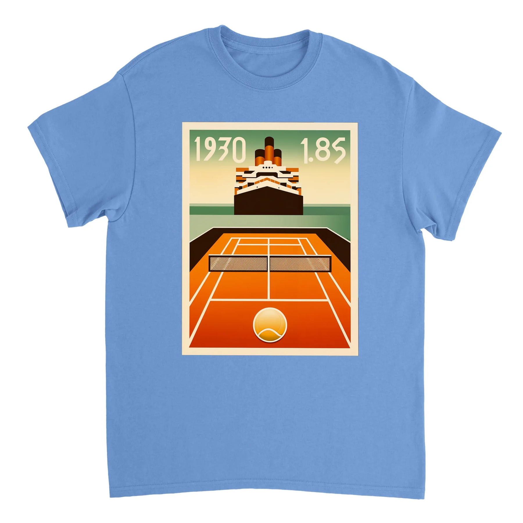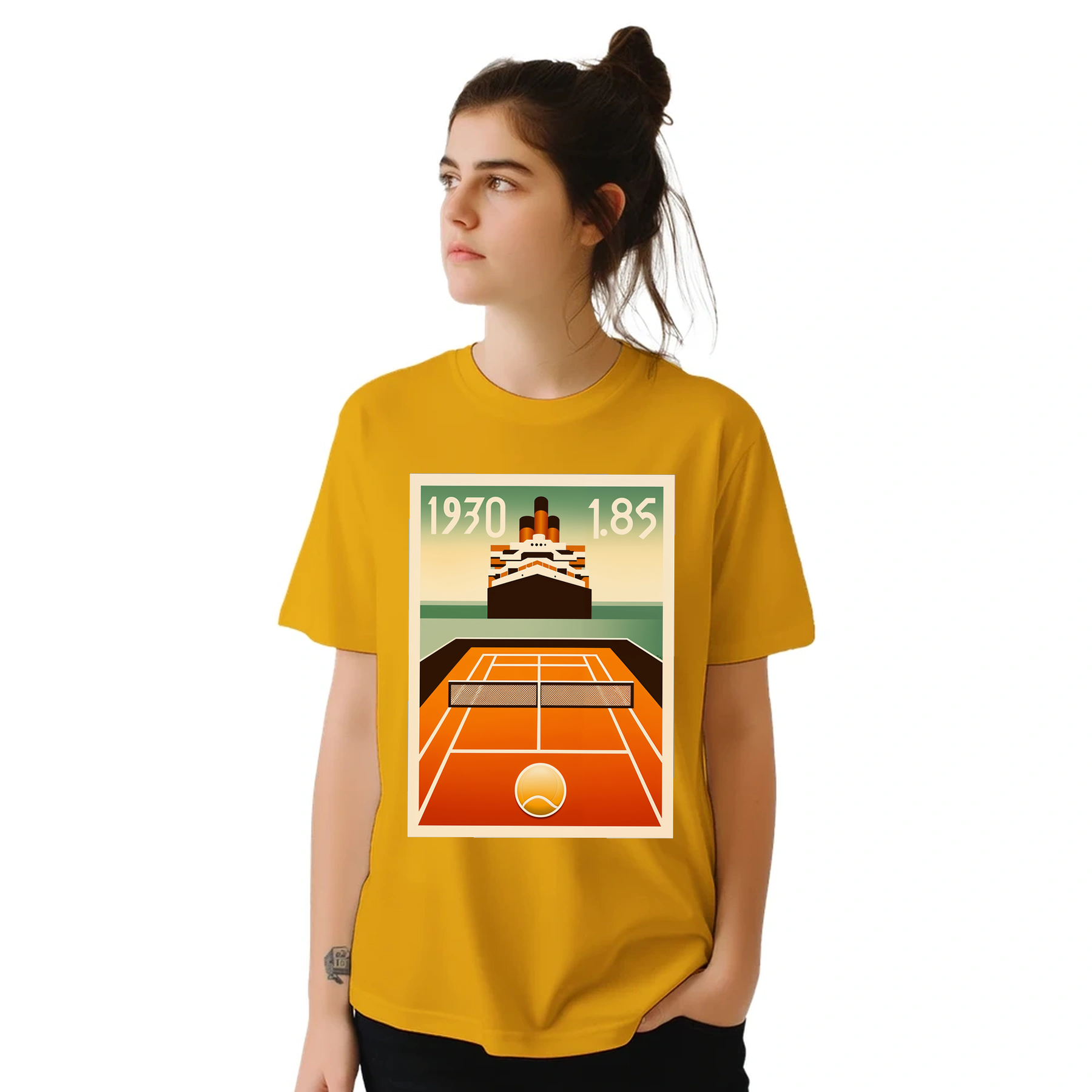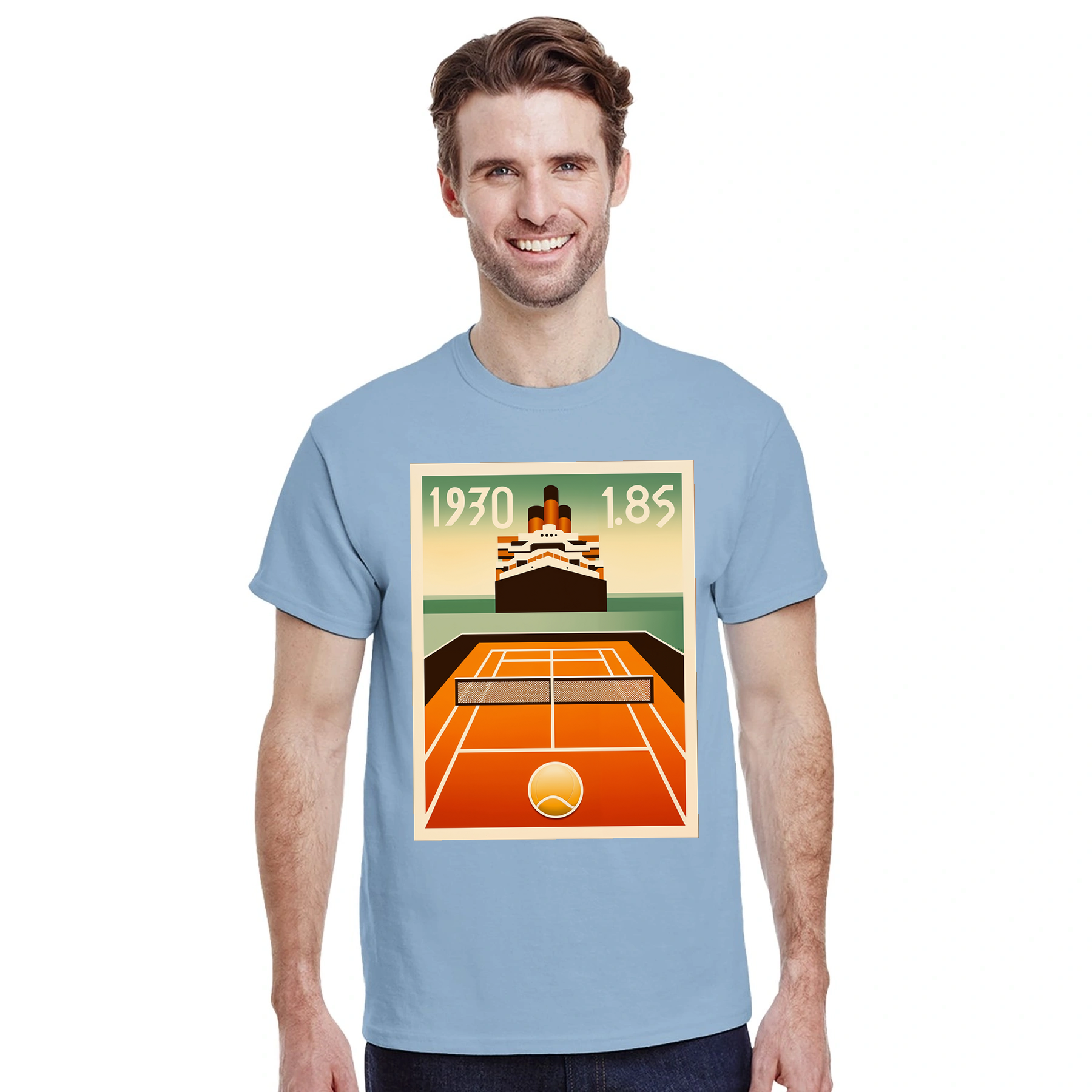 タイタニックテニスTシャツ。クラシックなタイタニックのエレガンスとテニスの楽しさを融合したユニークなデザインのTシャツ。サイズ: S, M, L, XL, XXL。