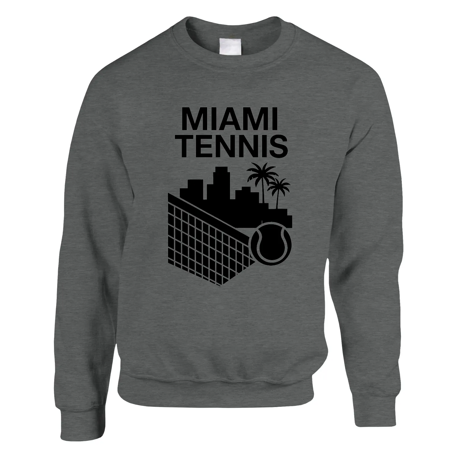 Buy the Miami Tennis Sweater for ultimate comfort and style. This thick, unisex sweatshirt, made from a soft 50% cotton and 50% polyester blend, features air-jet spun fabric for reduced pilling. Enjoy its classic cut, double-needle stitching, and 1x1 rib knit with spandex for extra stretch. Perfect for everyone!