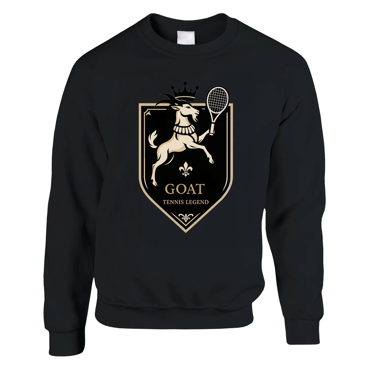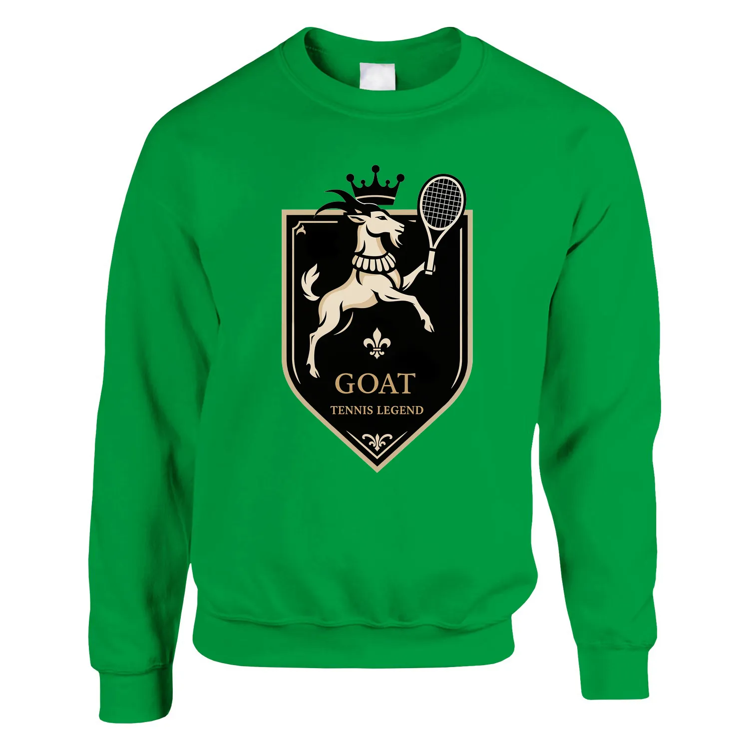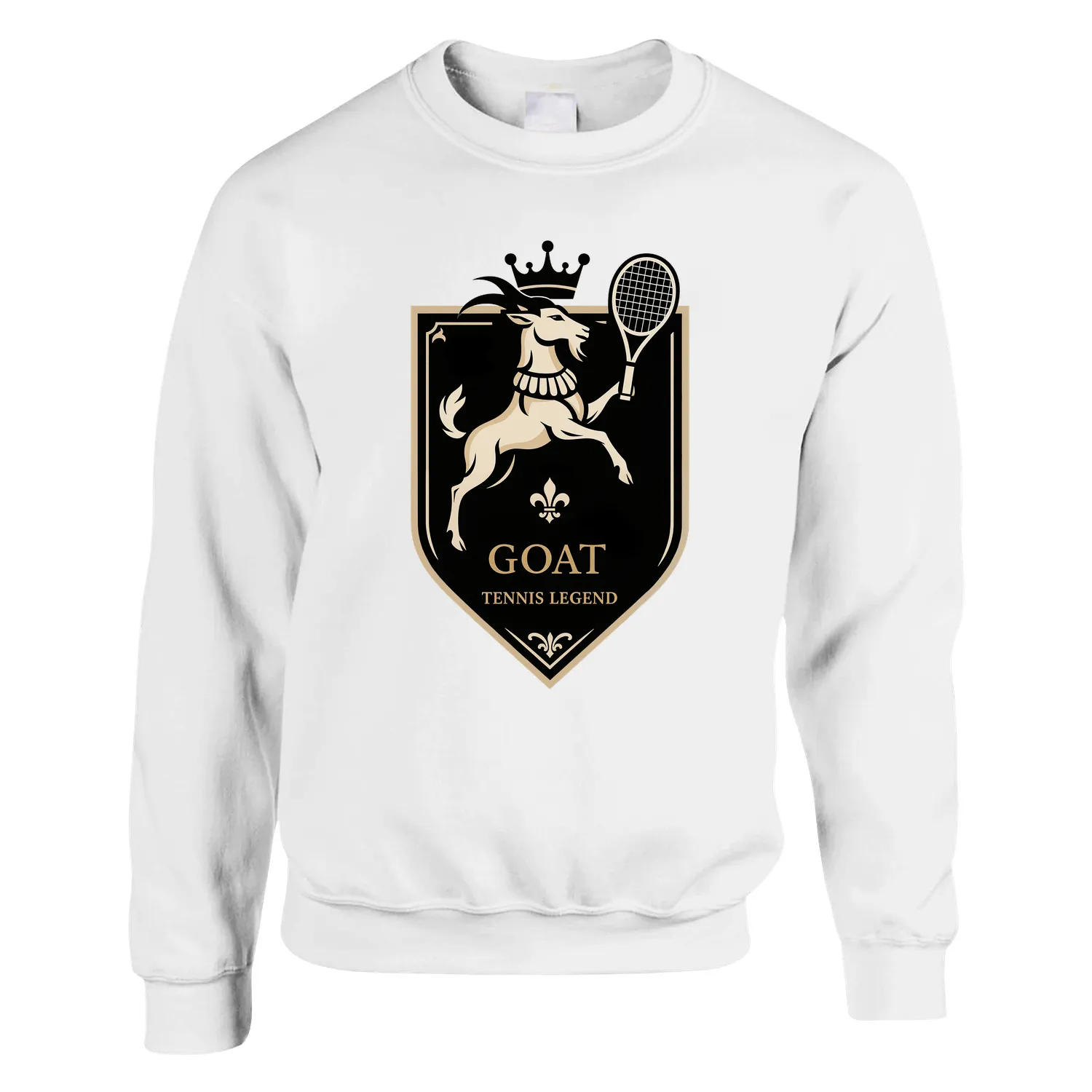 Buy the Sweater Tennis Legend GOAT2 for ultimate comfort and style! This thick, unisex sweater features a soft 50/50 cotton-polyester blend, air-jet spun for a smooth feel. With double-needle stitching and 1x1 rib knit with spandex, it ensures durability and stretch. Perfect for everyone!