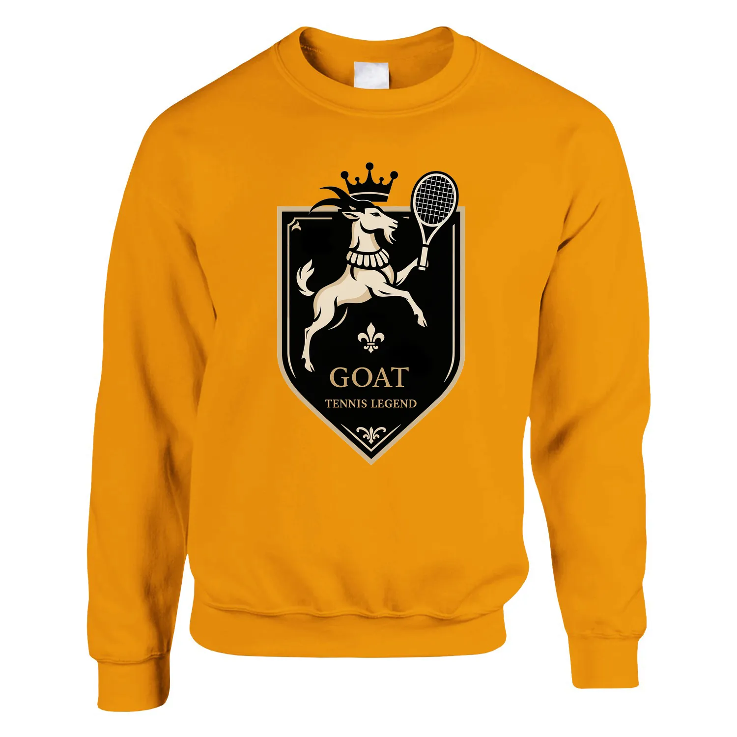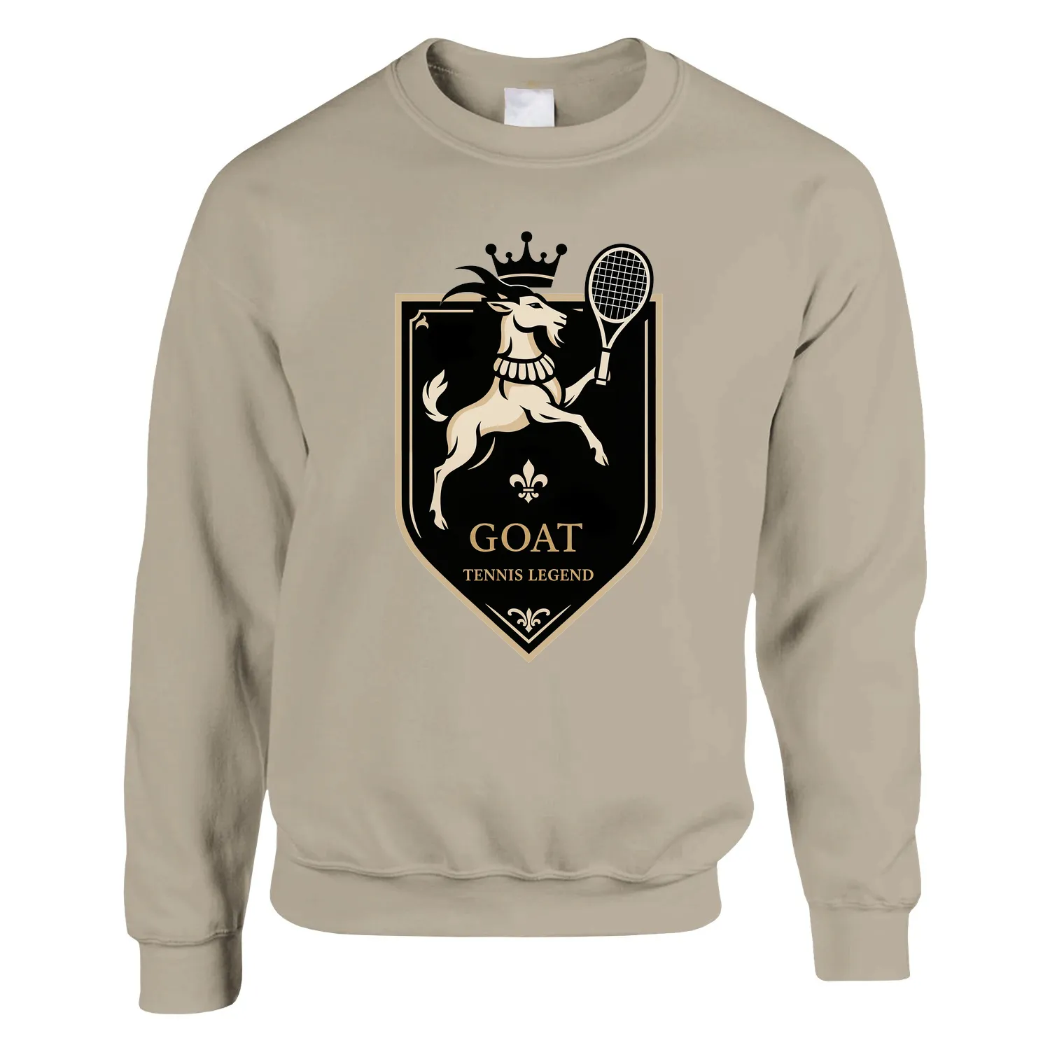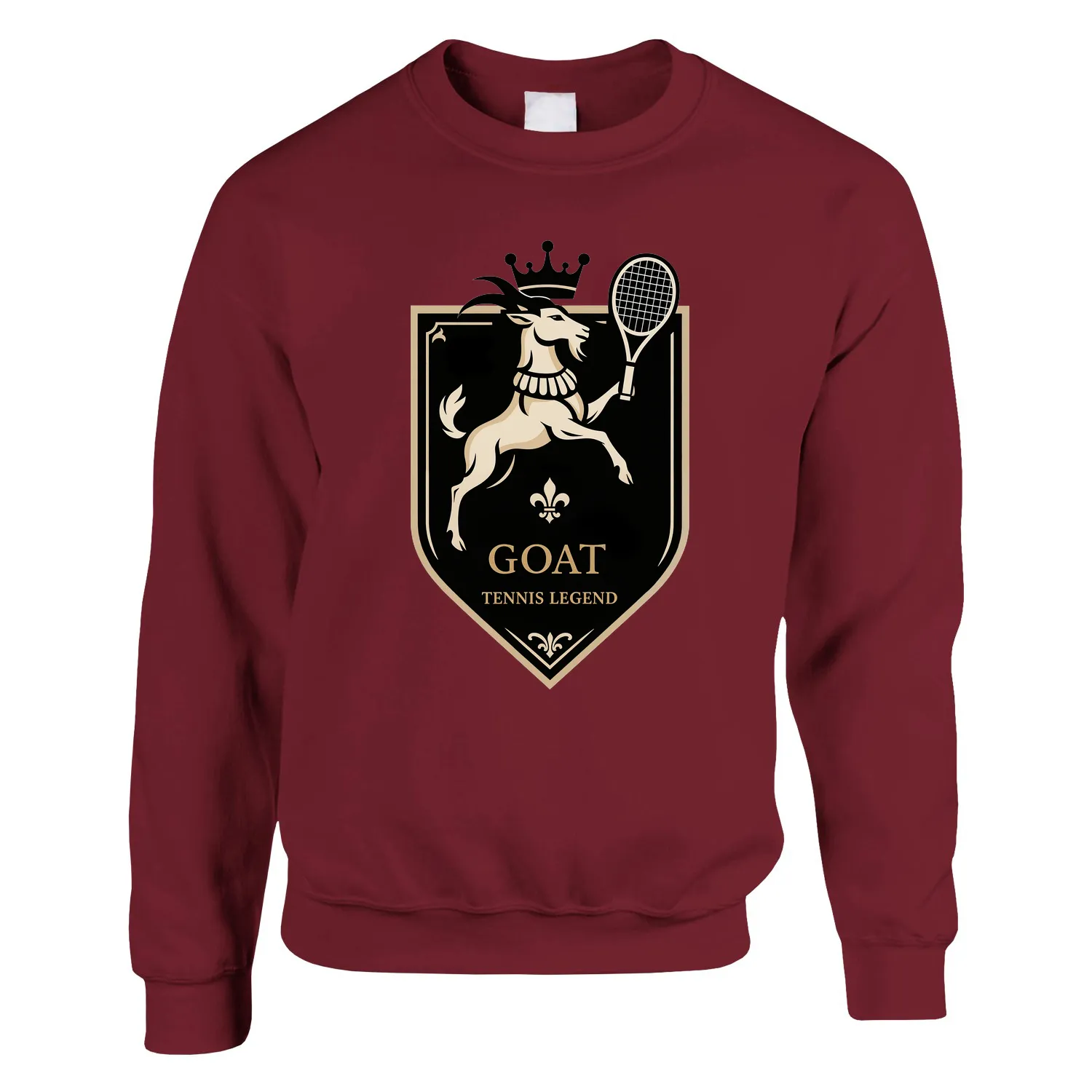 Buy the Sweater Tennis Legend GOAT2 for ultimate comfort and style! This thick, unisex sweater features a soft 50/50 cotton-polyester blend, air-jet spun for a smooth feel. With double-needle stitching and 1x1 rib knit with spandex, it ensures durability and stretch. Perfect for everyone!