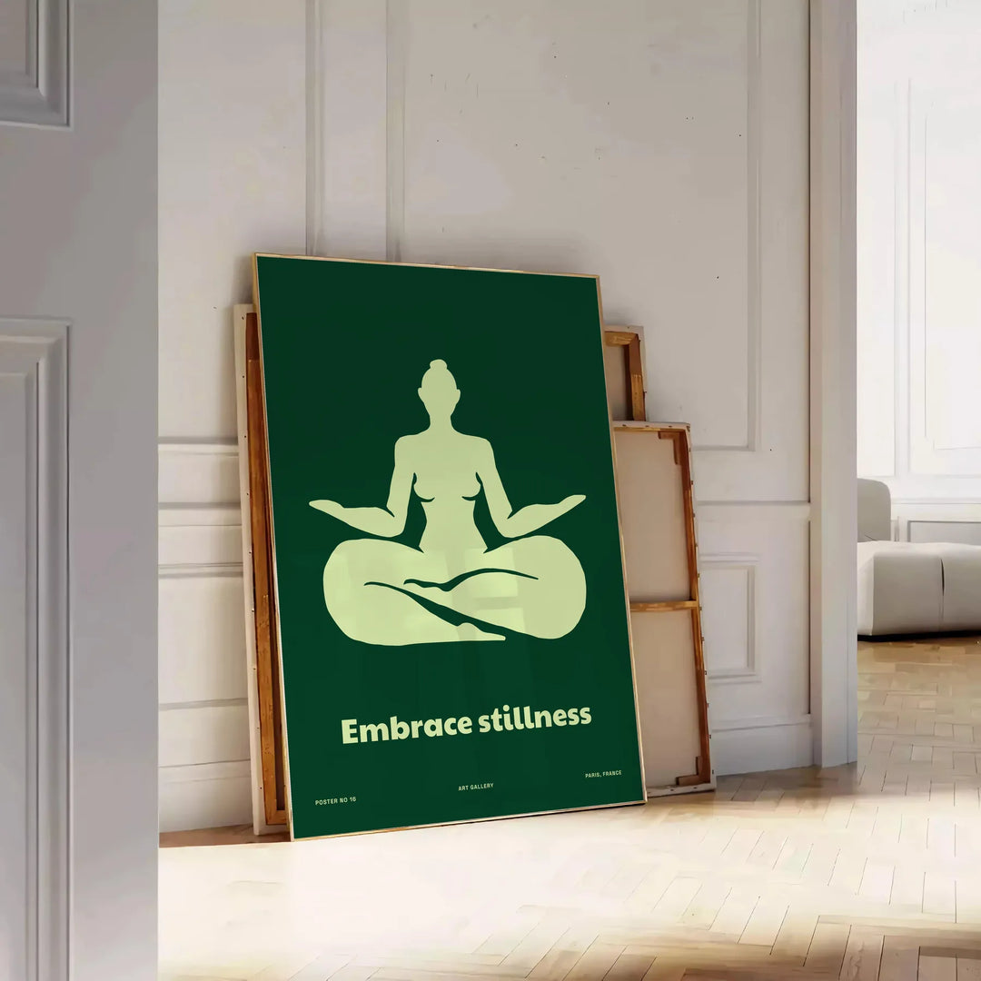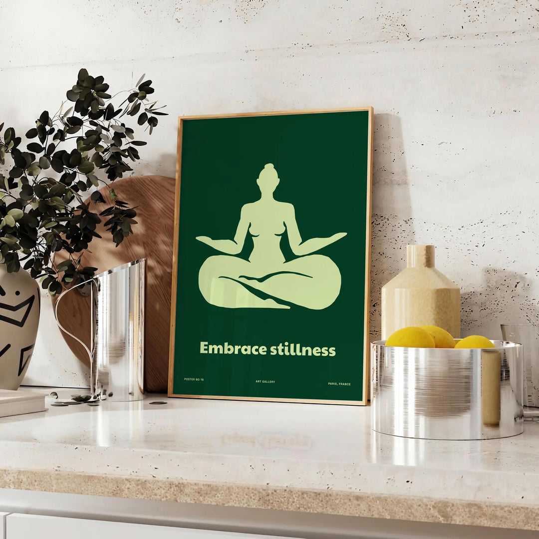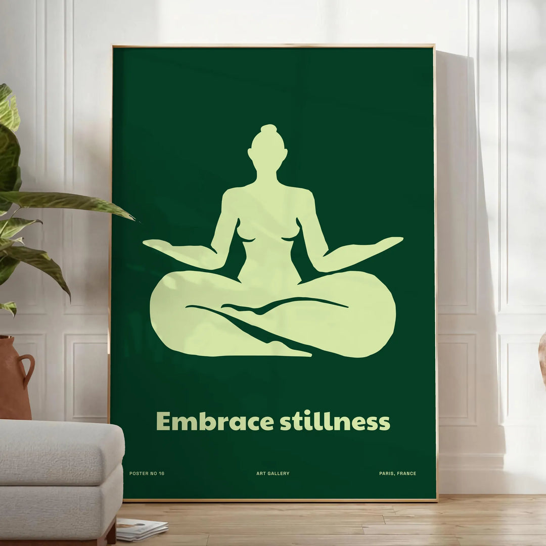 Plakat "Embrace Stillness" przedstawiający jogę w uspokajających odcieniach zieleni i szarości, idealny jako prezent lub eleg