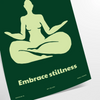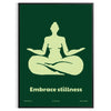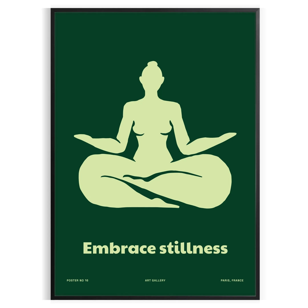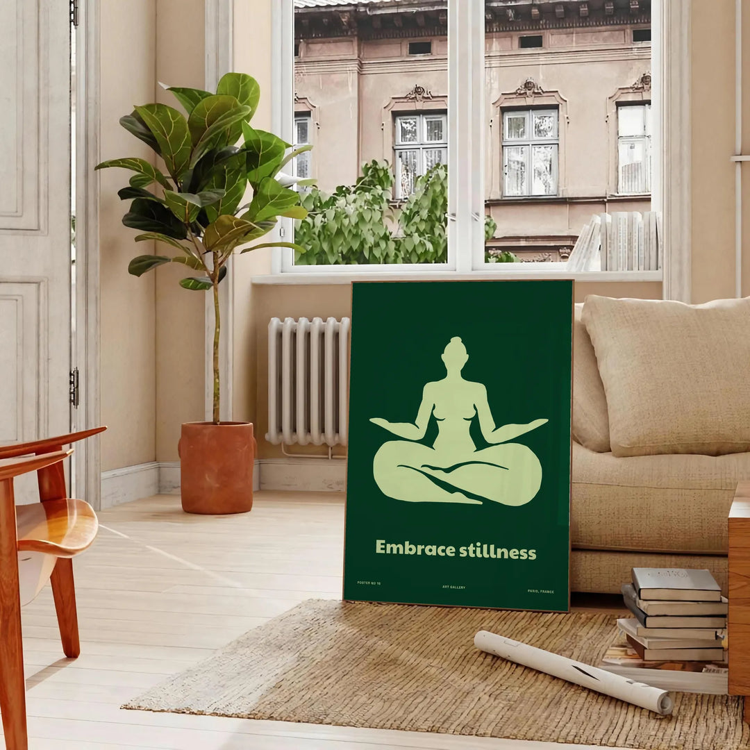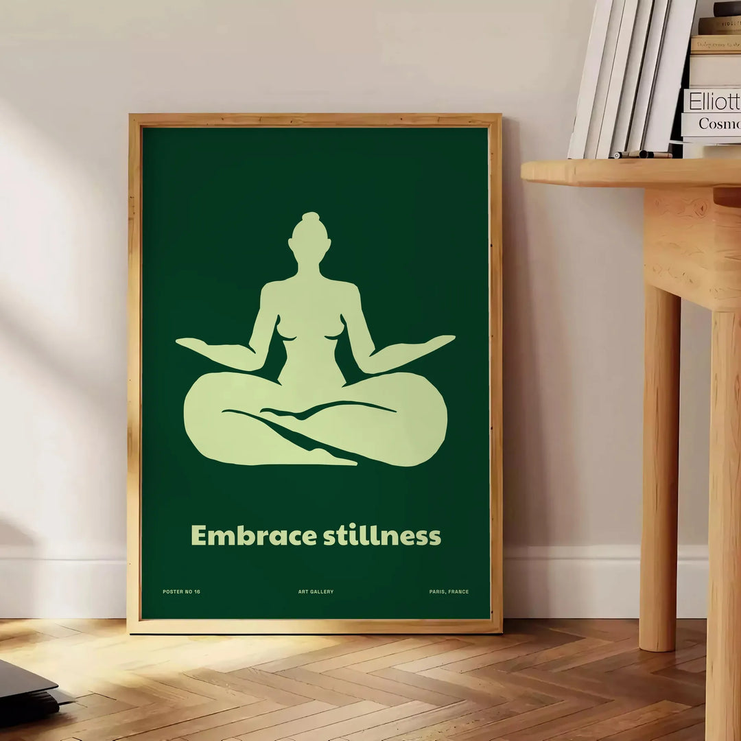 Plakat "Embrace Stillness" przedstawiający jogę w uspokajających odcieniach zieleni i szarości, idealny jako prezent lub eleg
