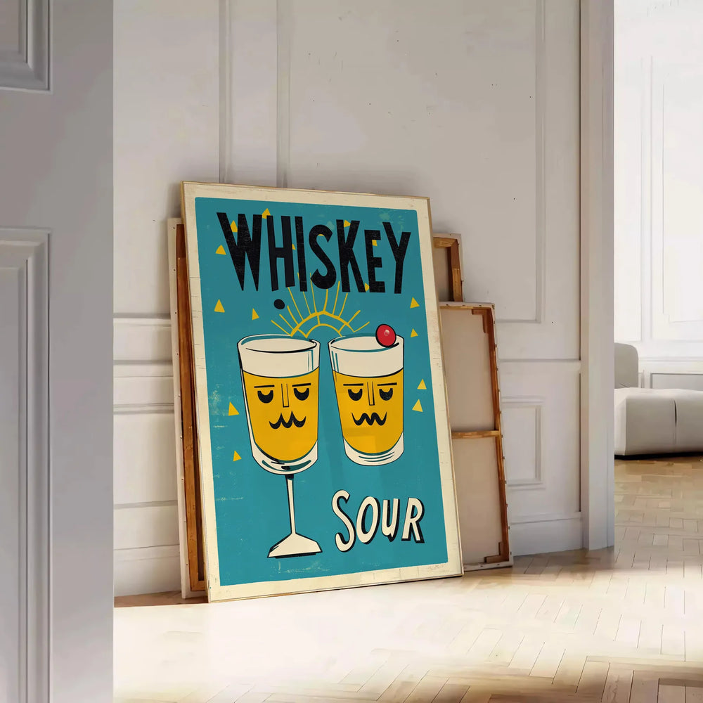 Plakat przedstawiający koktajl Whiskey Sour w żywych żółtych i niebieskich kolorach, idealny do dekoracji wnętrz i jako wyjąt