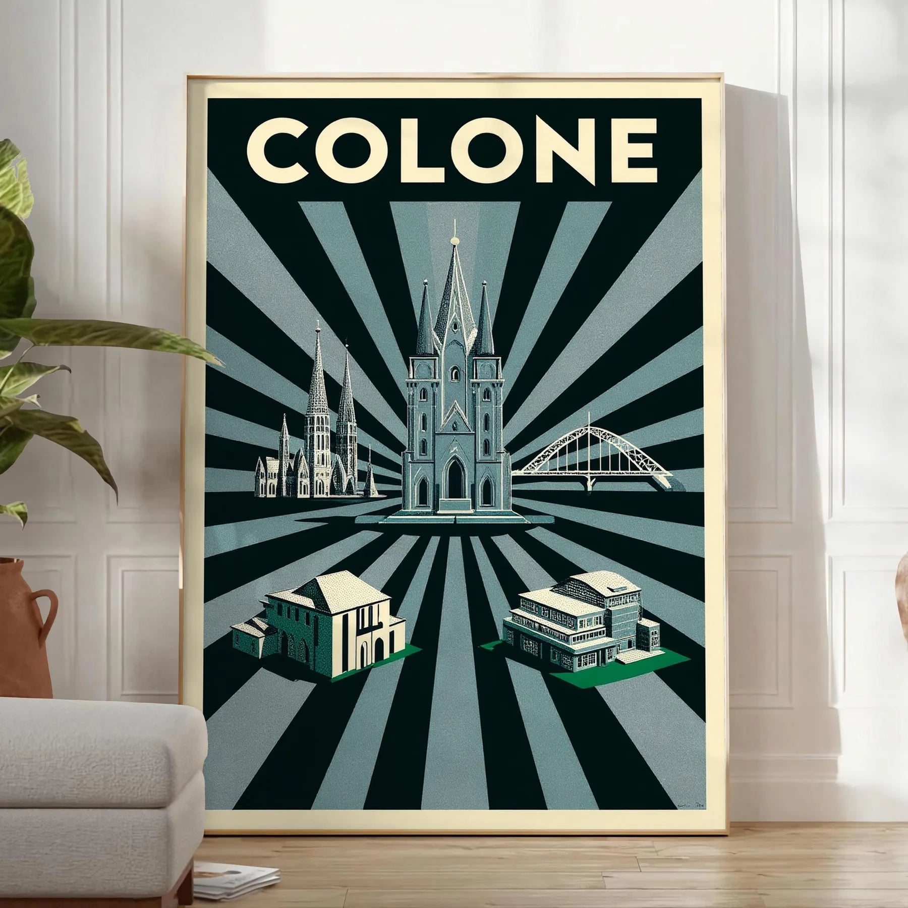 Elevate your space with this stunning Art Déco vintage poster featuring Cologne, Germany, in rich green and black hues. Perfect for art lovers, this eye-catching piece measures 50x70 cm or 30x40 cm. Buy now to enhance your home decor! Options include A4, 30×40 cm, 50×70 cm, 60×80 cm, and A0.