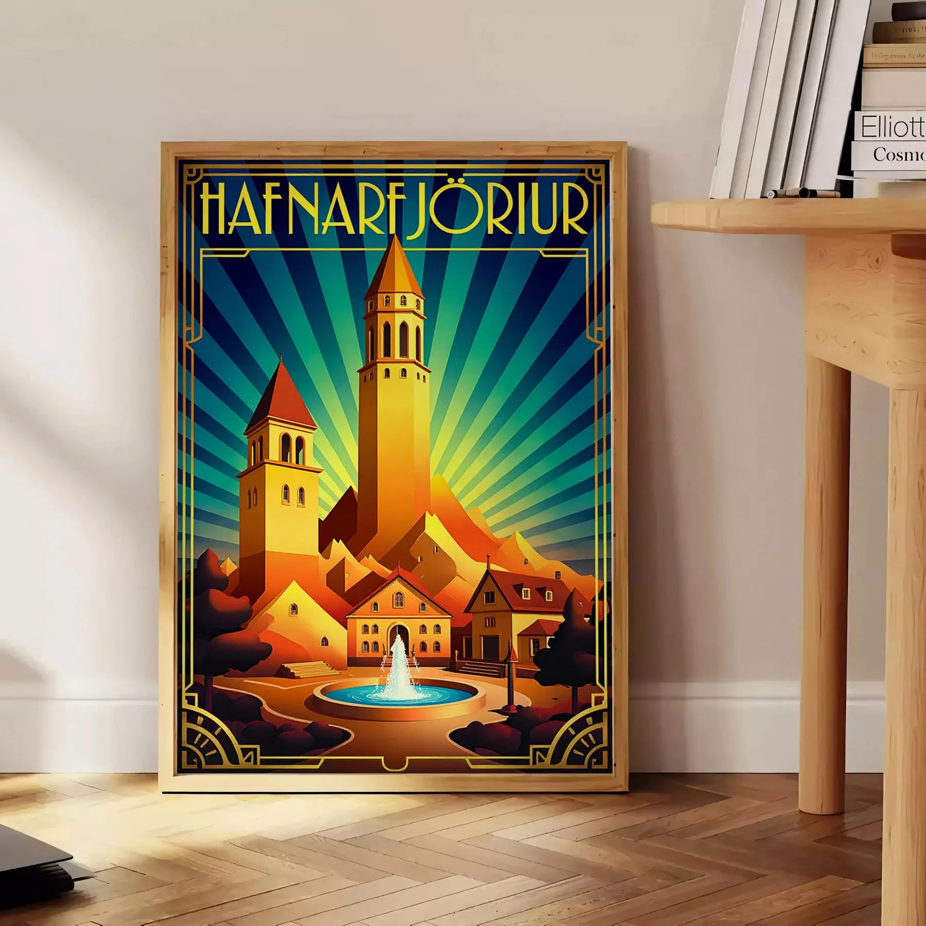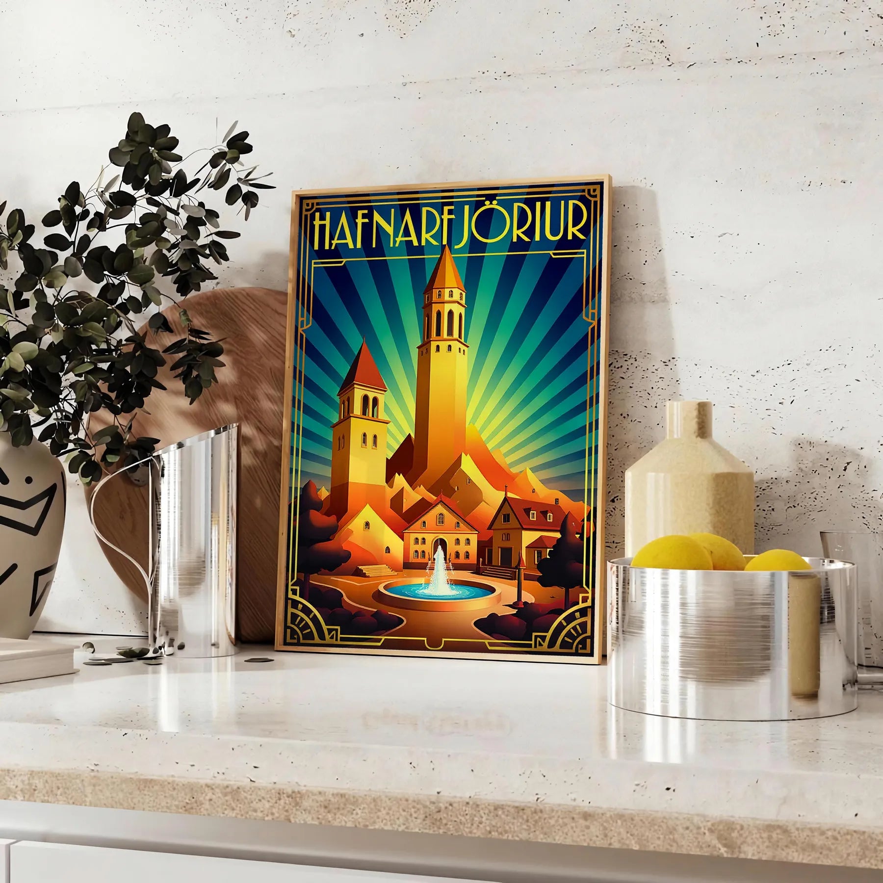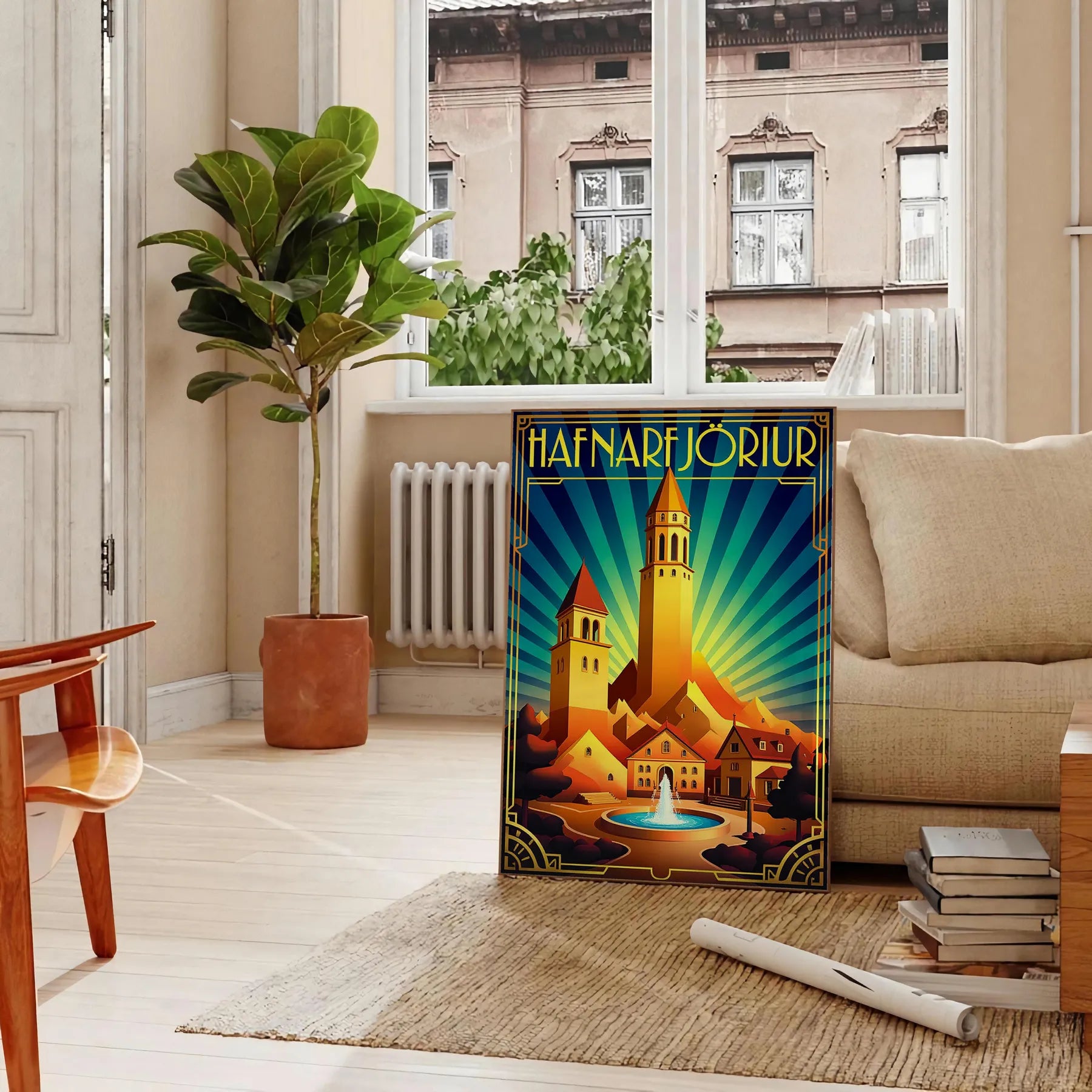 charm Hafnarfjörður Iceland stunning Art Déco vintage poster vibrant blue orange hues unique touch decor chance eye piece dimensions A4 cm A0