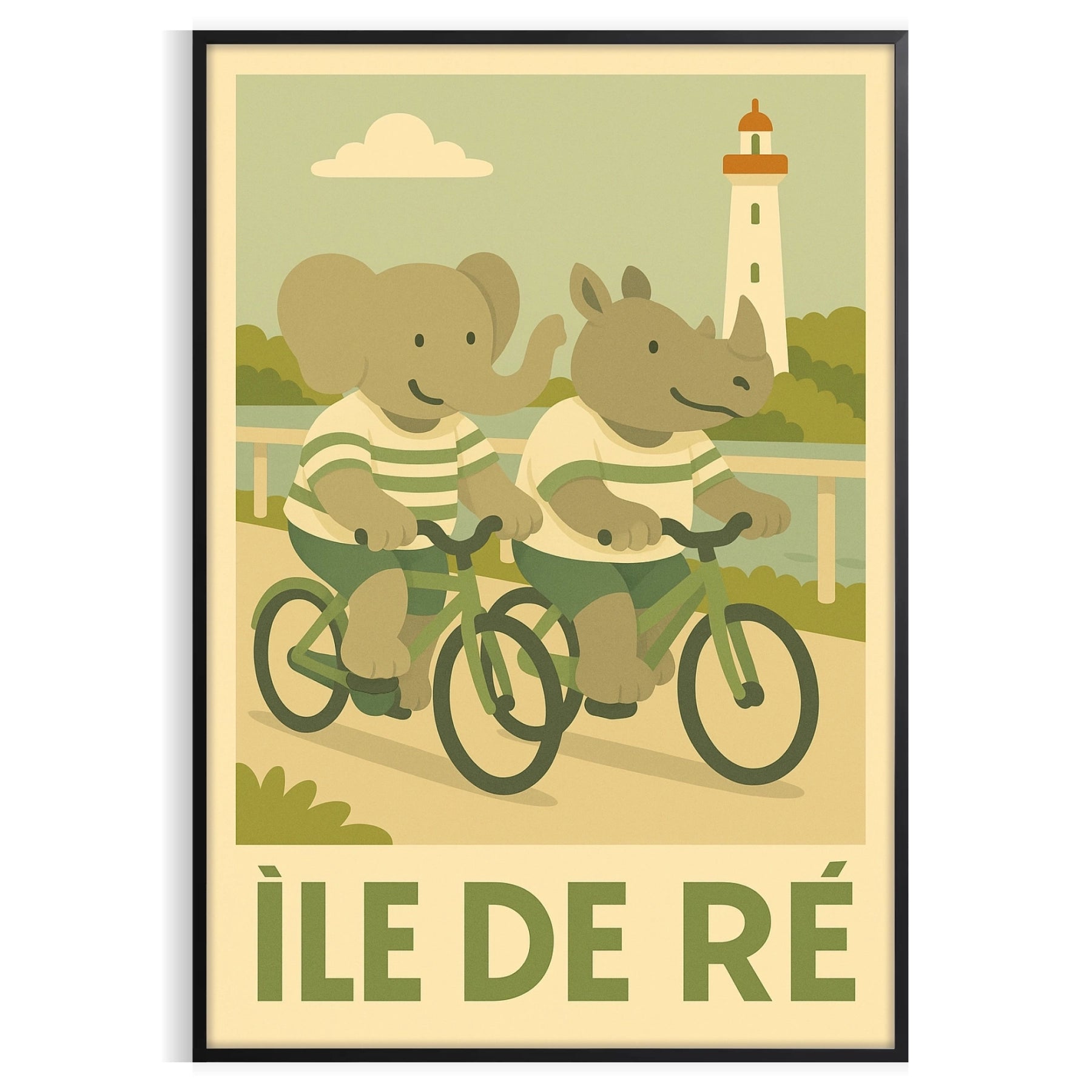 Discover the charming kid elephant and rhinoceros cycling through the vibrant landscapes of Île de Ré in this delightful poster. Adorned in soft gray and green hues, this 50x70 or 30x40 piece will brighten any space. Buy now to bring joy to your walls! This poster is available framed or unframed.