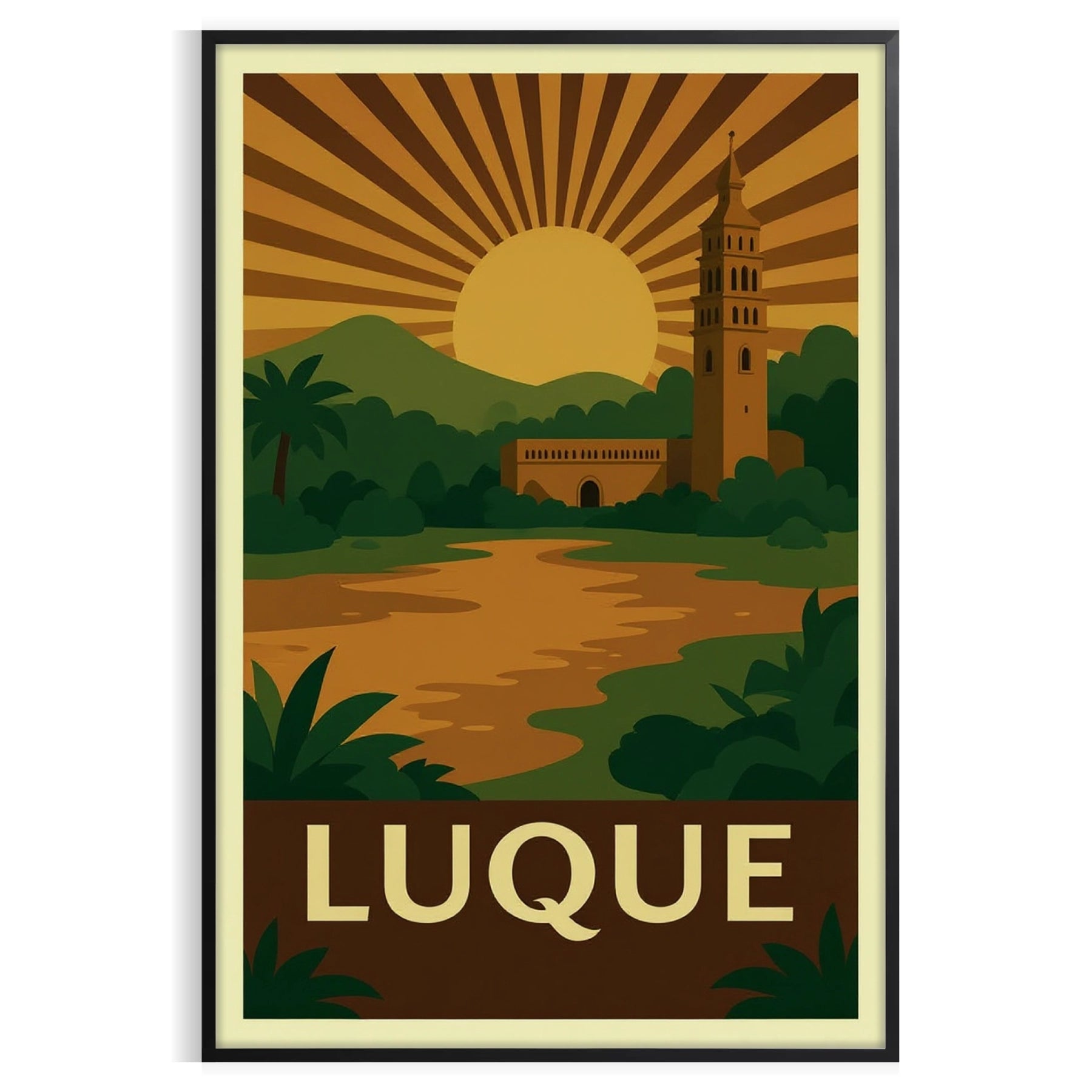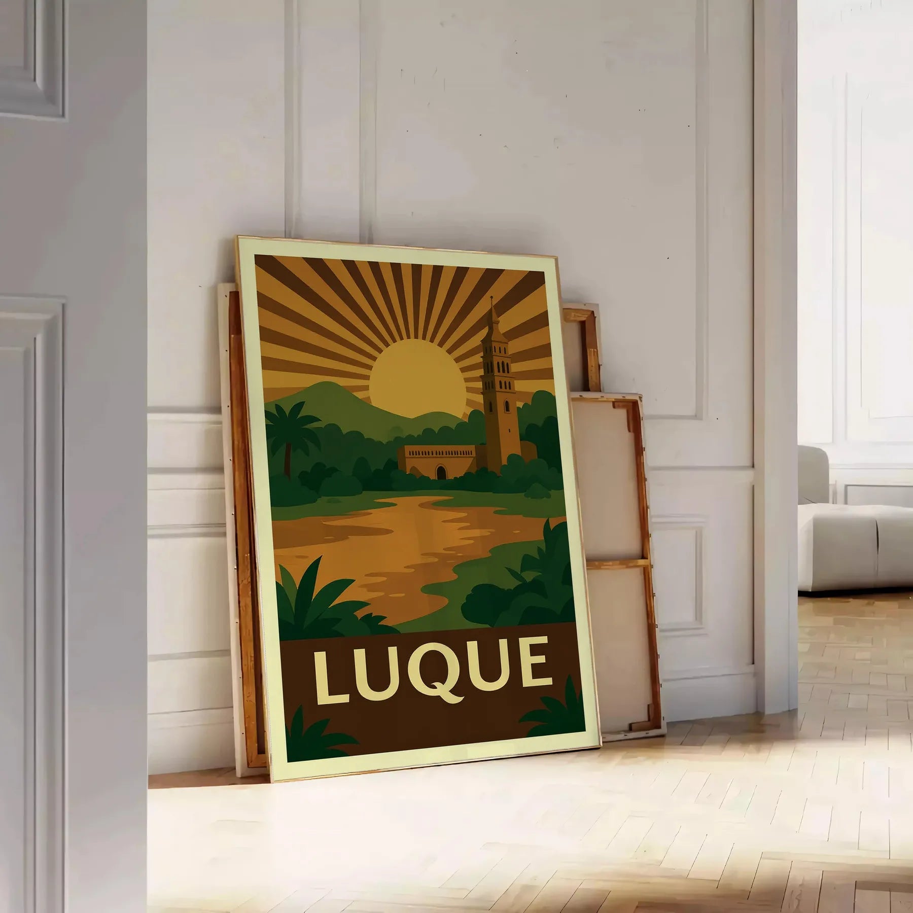 Elevate your space with our stunning vintage Art Déco poster inspired by Luque, Paraguay. Featuring earthy tones of brown and green, this captivating piece measures 50x70 cm or 30x40 cm. Buy this unique artwork today and transform your decor. Formats offered: A4, 30×40 cm, 50×70 cm, 60×80 cm, and A0.