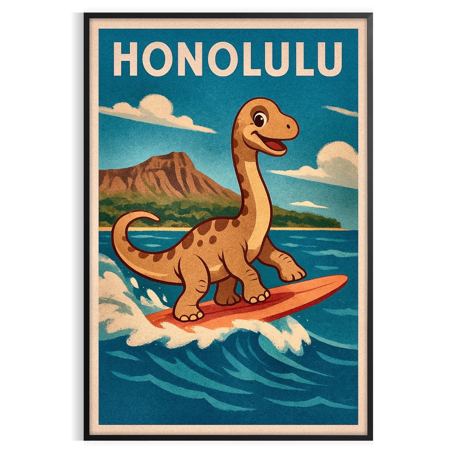 Upplev en färgglad surfäventyr med vår barnposter med dinosaurier! Den lekfulla designen i blå och bruna toner passar perfekt i barnrummet eller lekrummet.